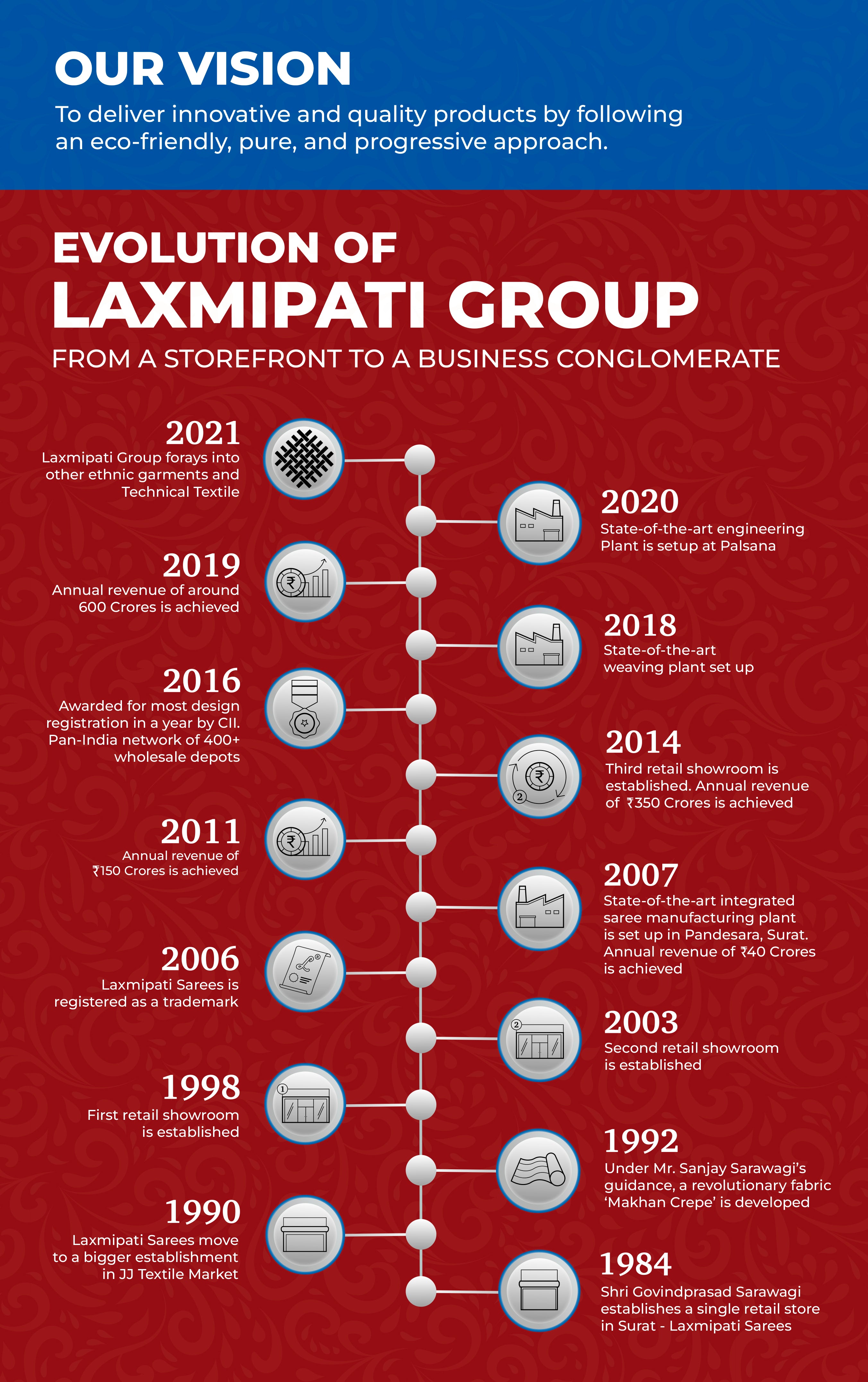 Laxmipati Sarees, the flagship company of the Laxmipati Group, was incepted in 1984 with a mission to provide top-quality fabrics and a wide assortment of products. We are one of the most recognized national brands and also India’s largest manufacturers of man-made fabric Sarees. Sarees, Kurtis, and Gowns, Lehengas, and Shirts comprise our core products that are crafted for a large spectrum of customers.