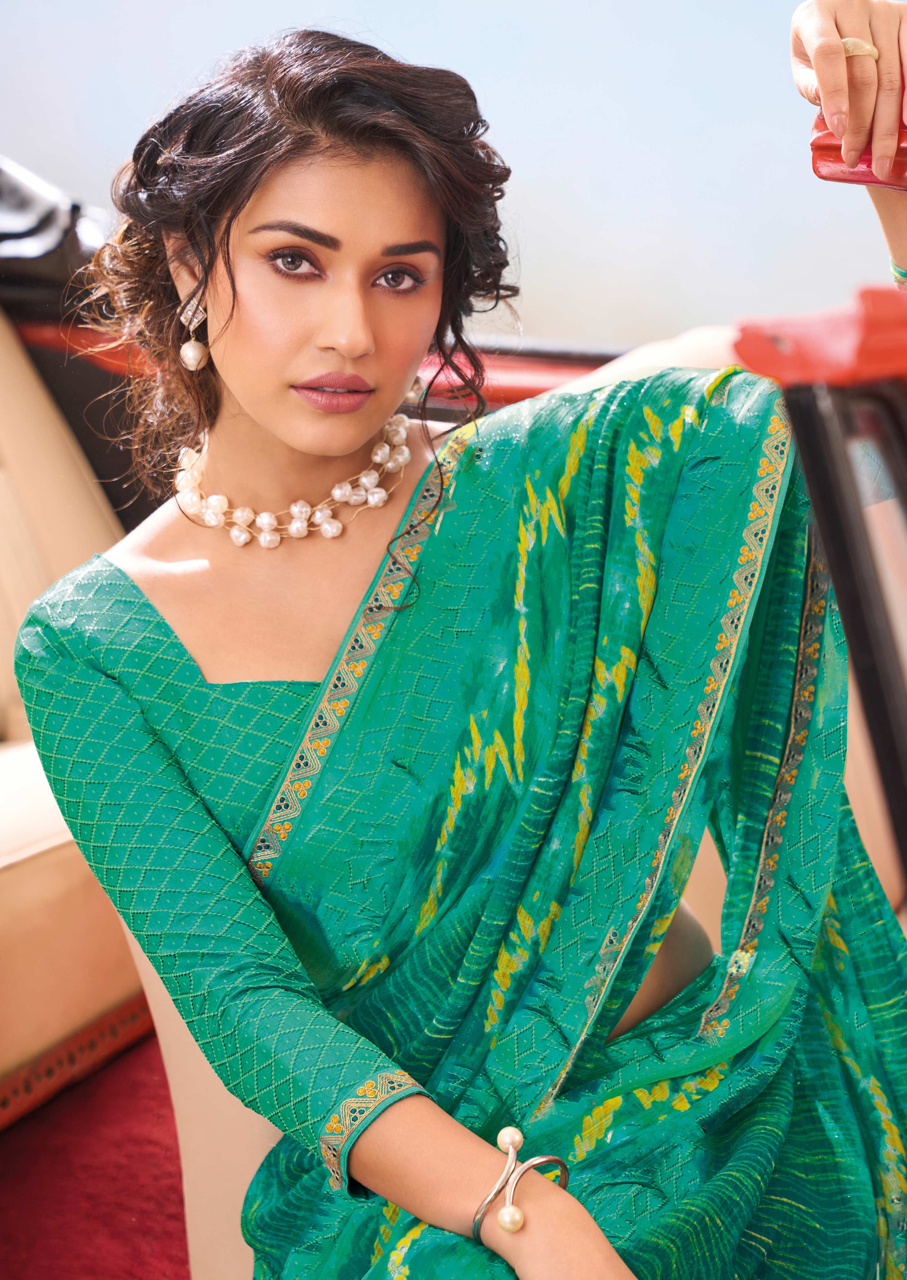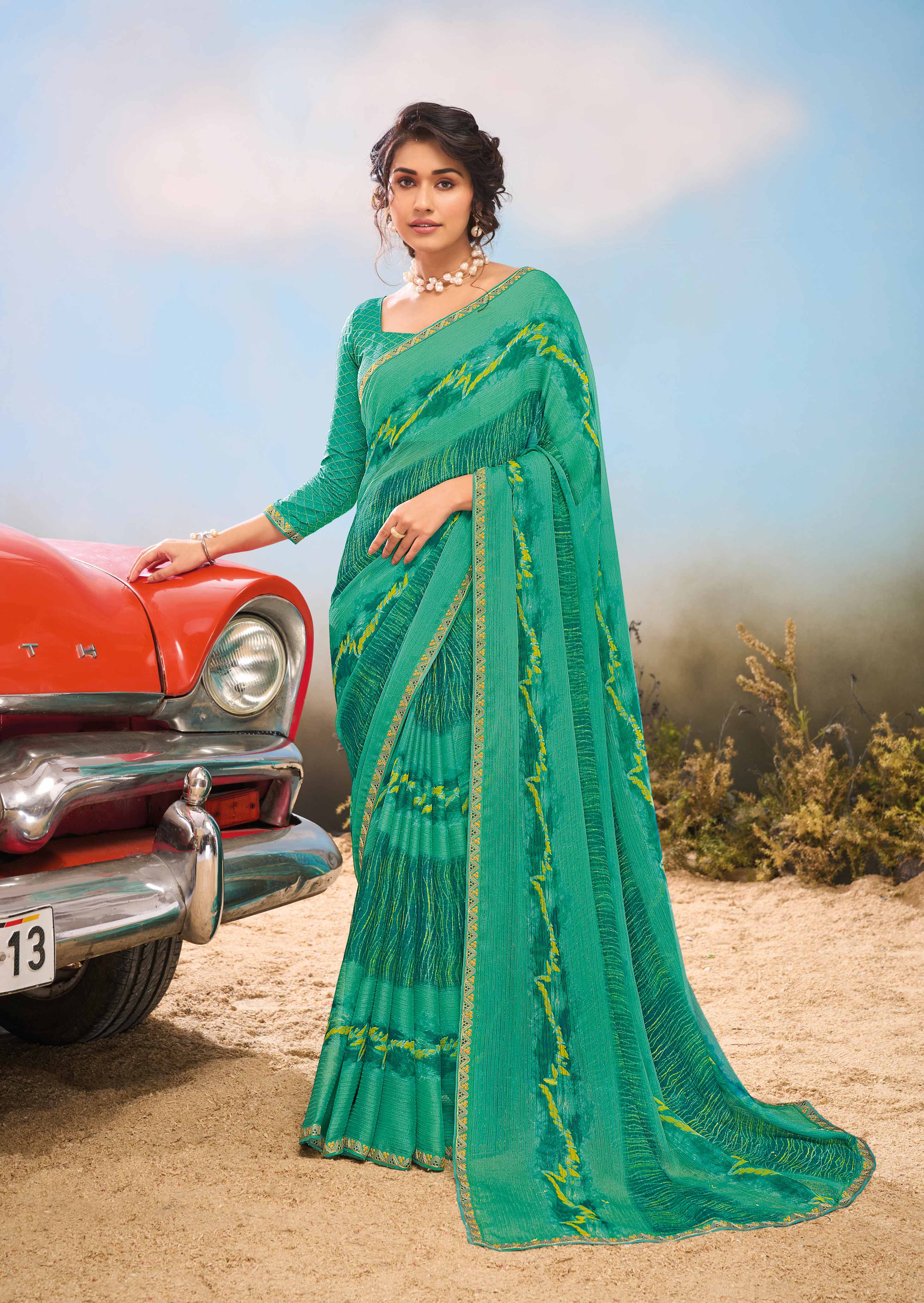 Laxmipati Baarish Abstract Printed Chiffon Saree in Teal Green Color with Unstitched Blouse
