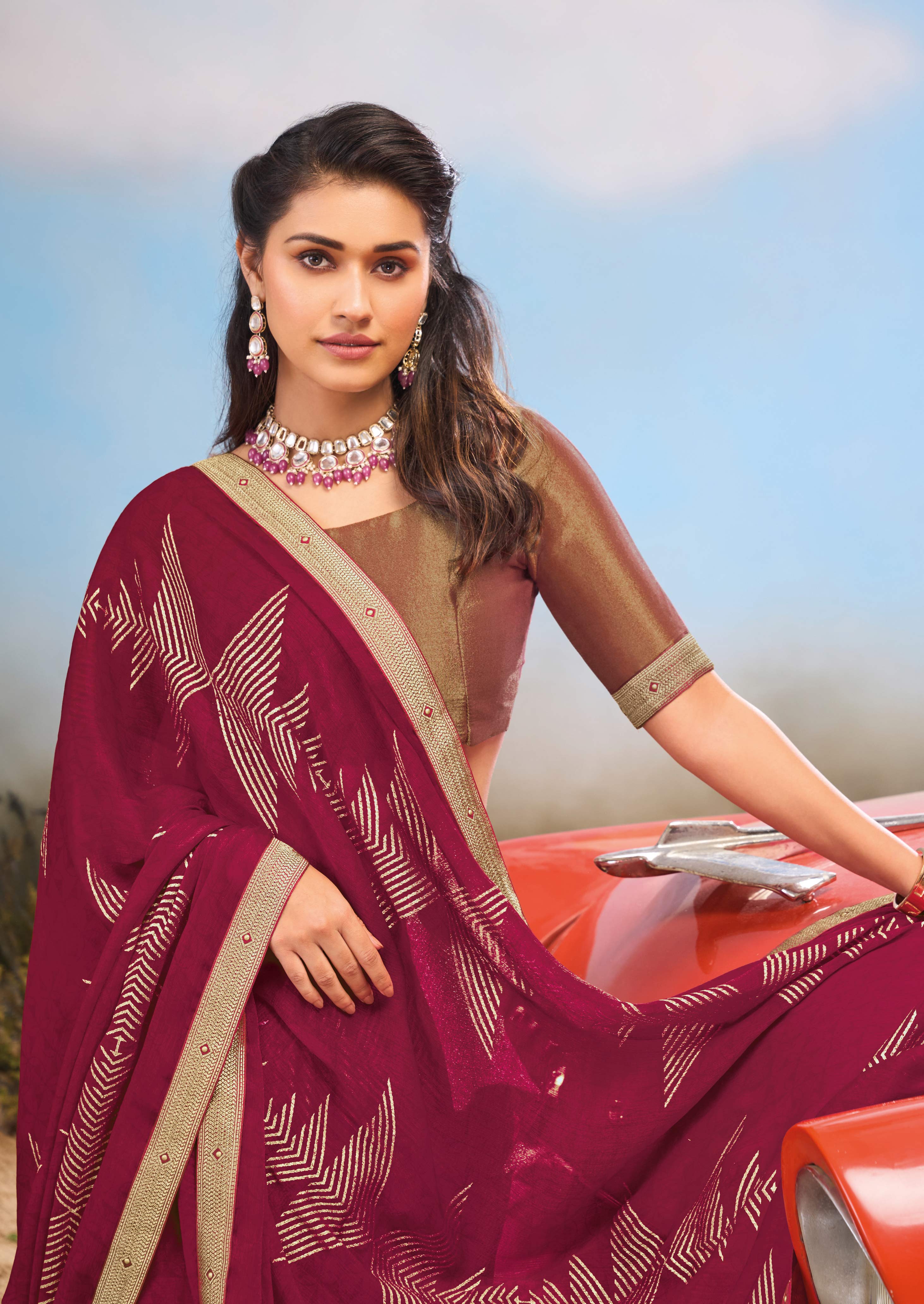 Laxmipati Baarish Geometric Printed Chiffon Saree in Wine Color with Unstitched Blouse