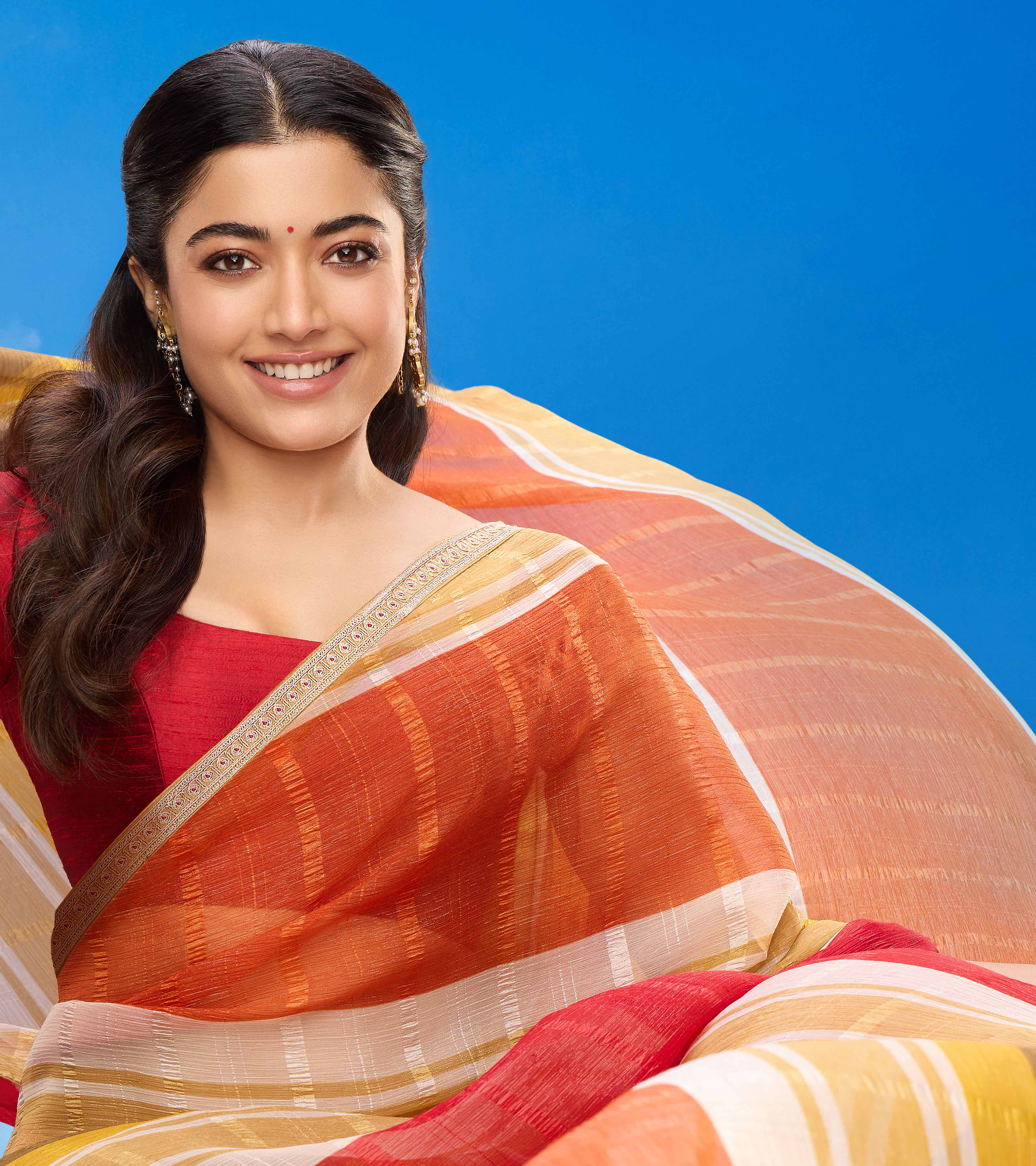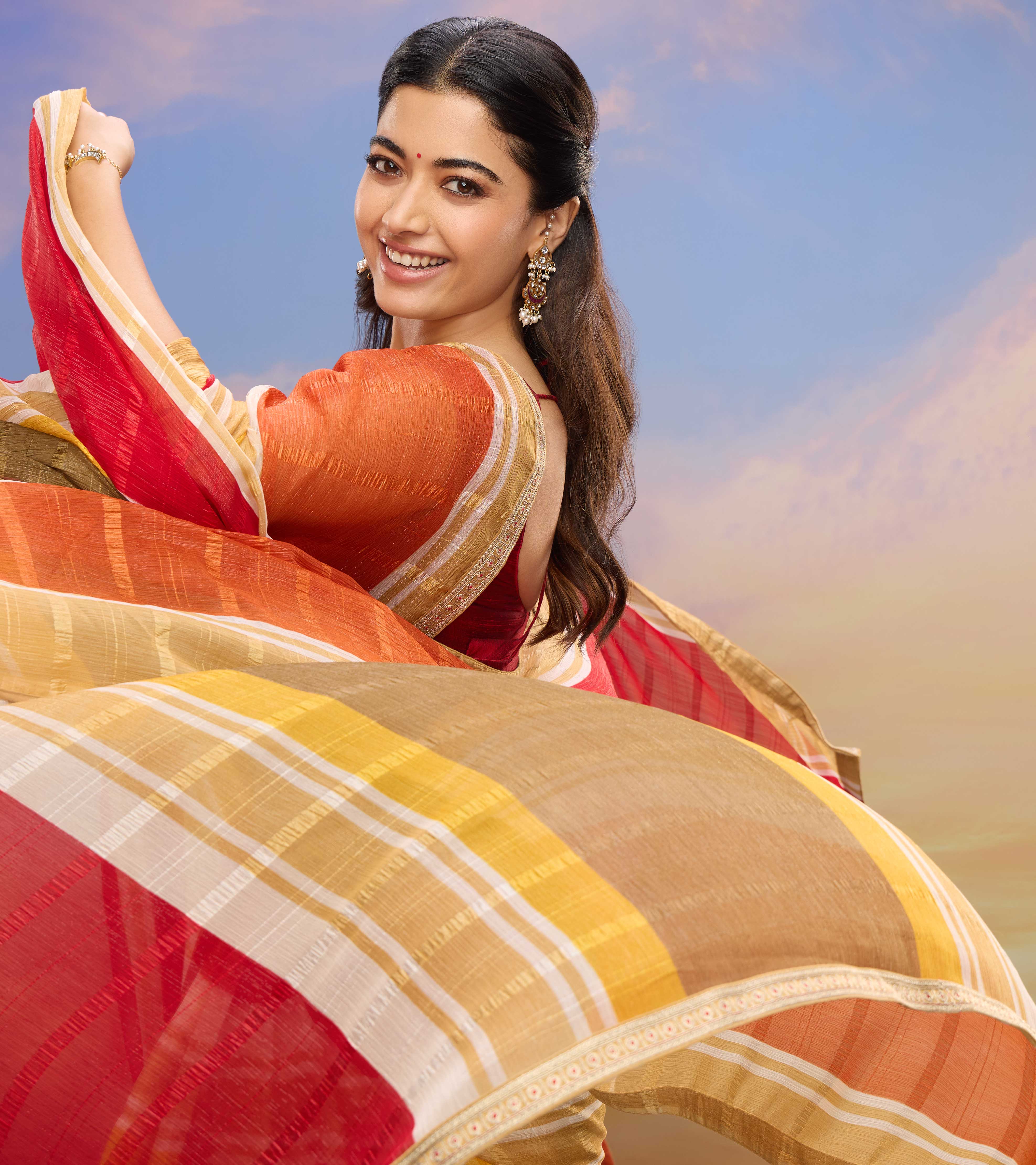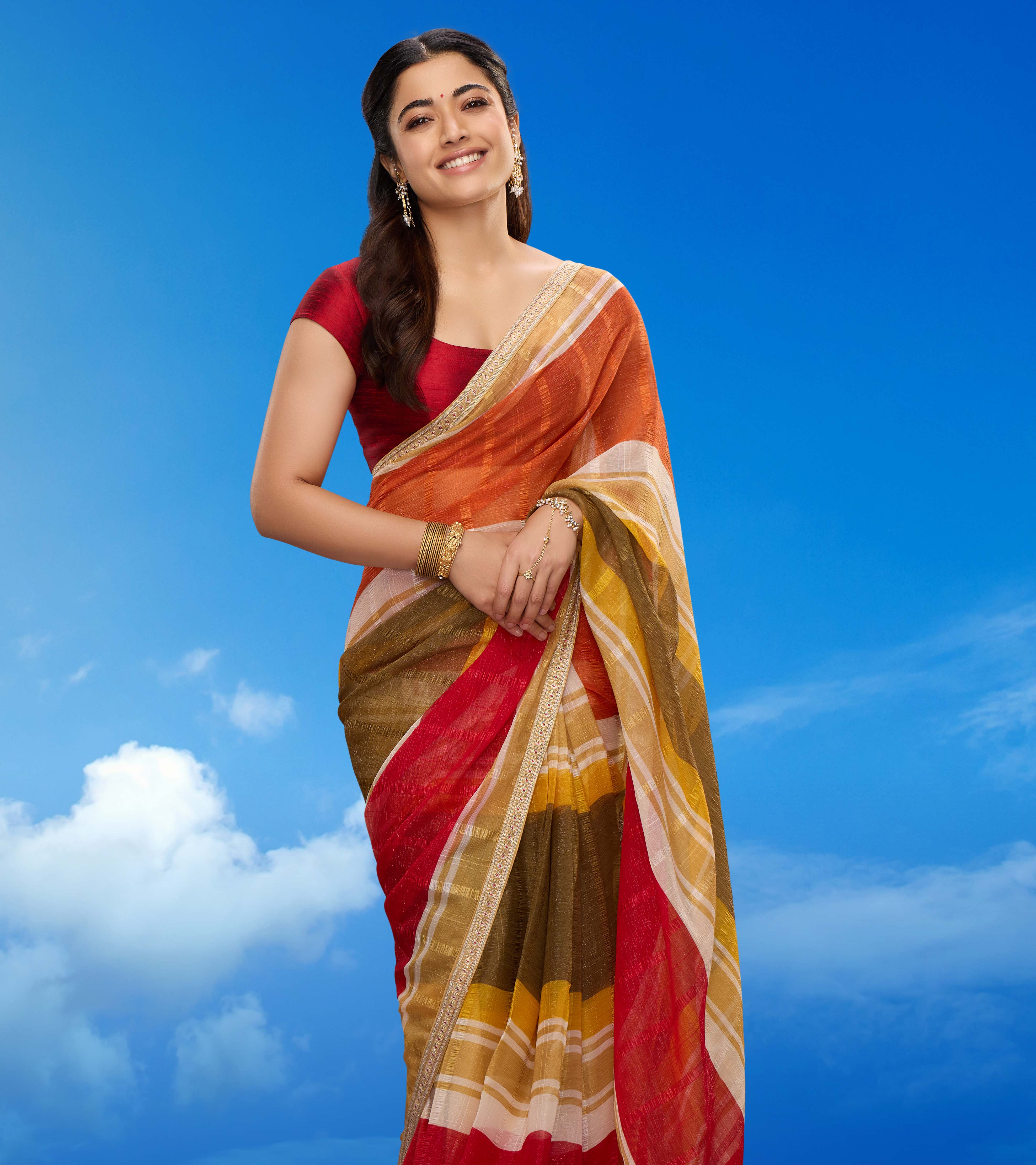 Rashmika for Laxmipati Striped Printed Chiffon Saree in Multicolor with Unstitched Blouse.