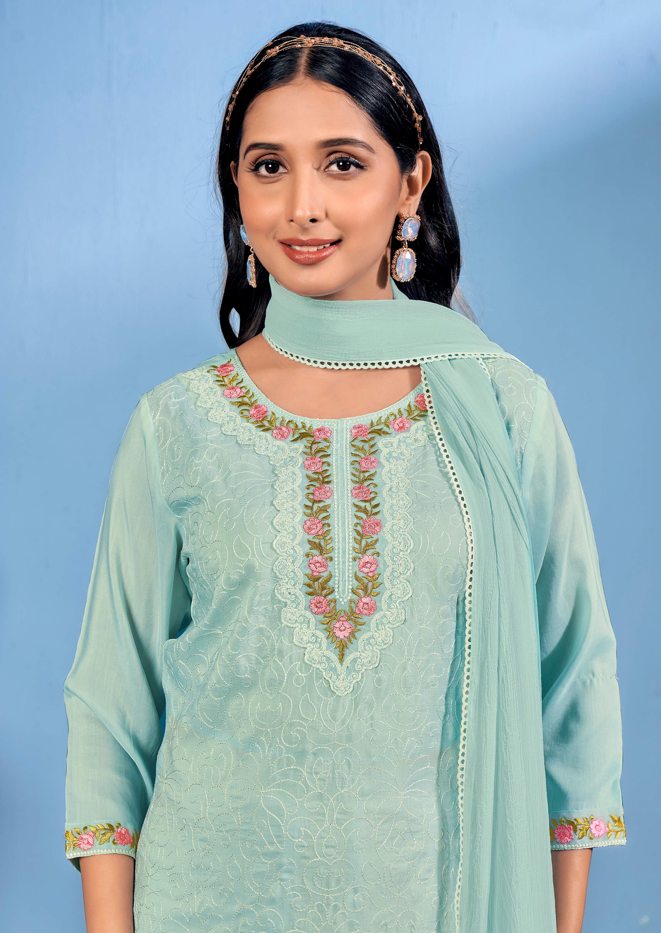 This stylish 3-piece set in a beautiful pastel teal green color includes a kurti, pant, and dupatta — all perfectly matching. The kurti is made from soft candy muslin fabric and features pretty floral embroidery all over, along with comfortable 3/4 sleeves.