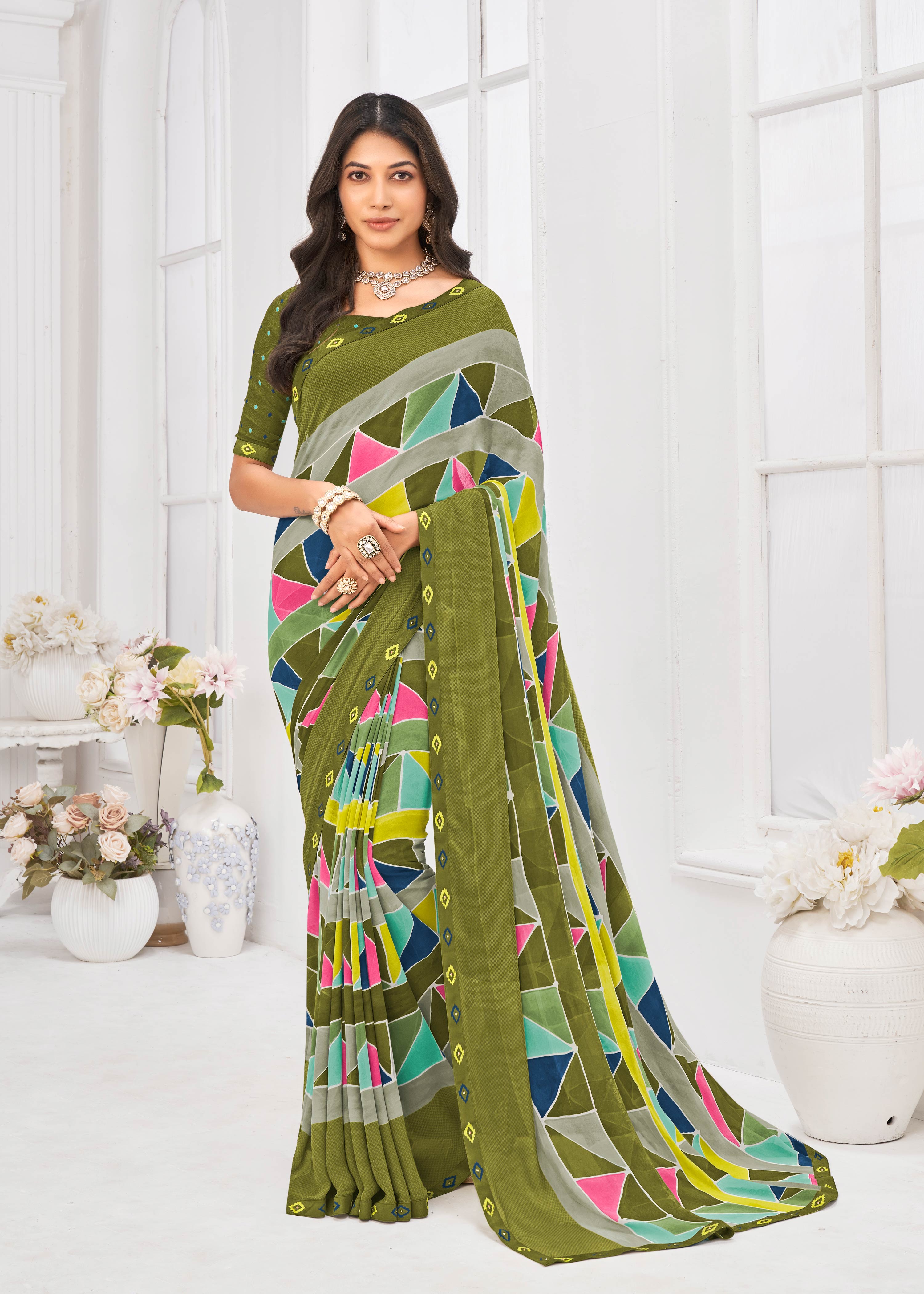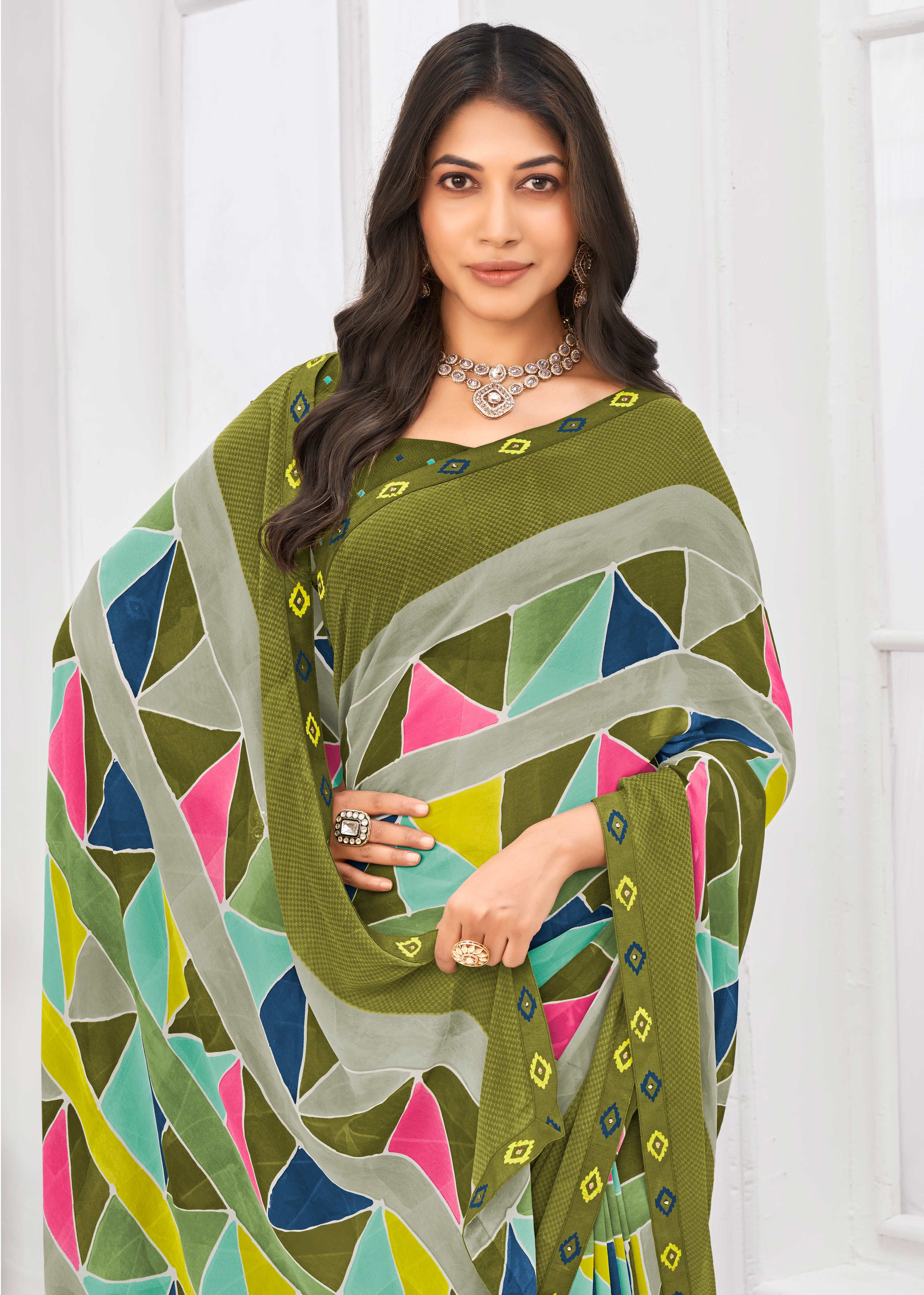 Laxmipati Dil Khushal Geometric Printed Georgette Saree in Olive Green Color with Unstitched Blouse