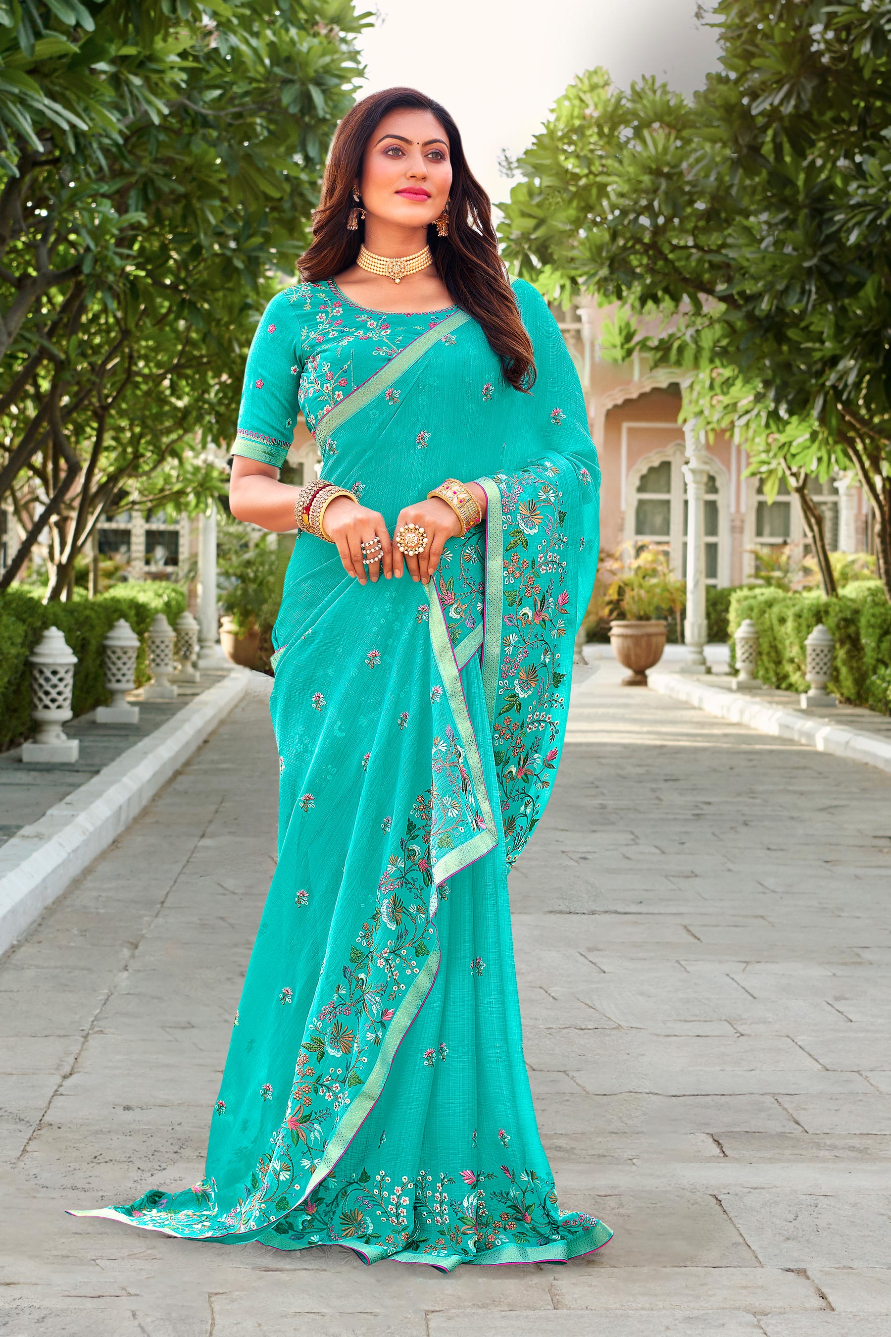 Laxmipati Falooda Floral Embroidered along with Stone Work Chiffon Saree in Sky Blue Color with Unstitched Blouse