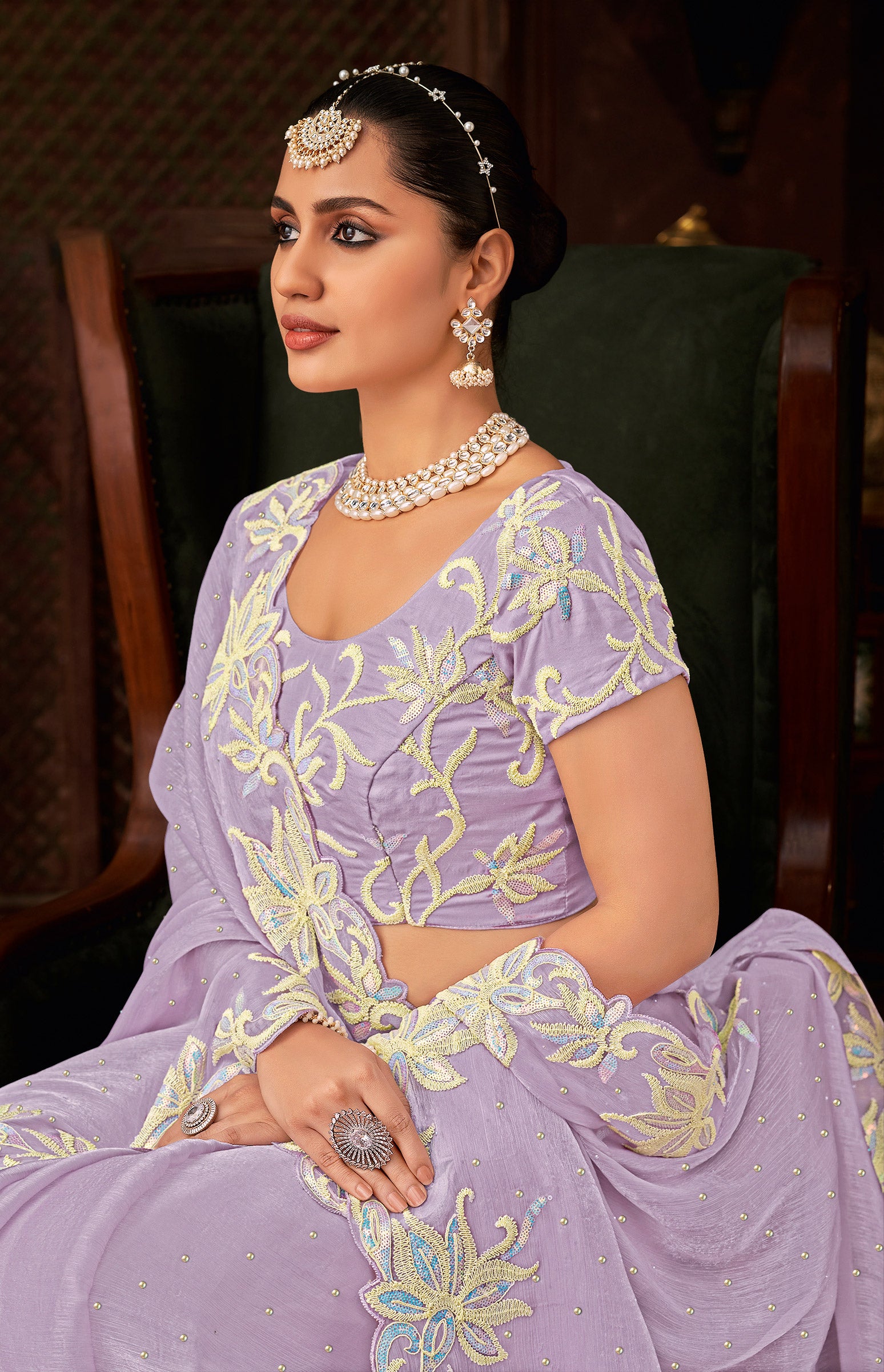 Let the intricate embroidery shine by keeping your accessories elegant yet minimal. Pair the saree with a pair of statement earrings or a delicate maang tikka, and skip the heavy necklace if the blouse is embellished. A sleek bun or soft waves will frame your look beautifully. Finish with embroidered juttis or metallic heels and a clutch to match the tone of the embroidery for a refined festive look.