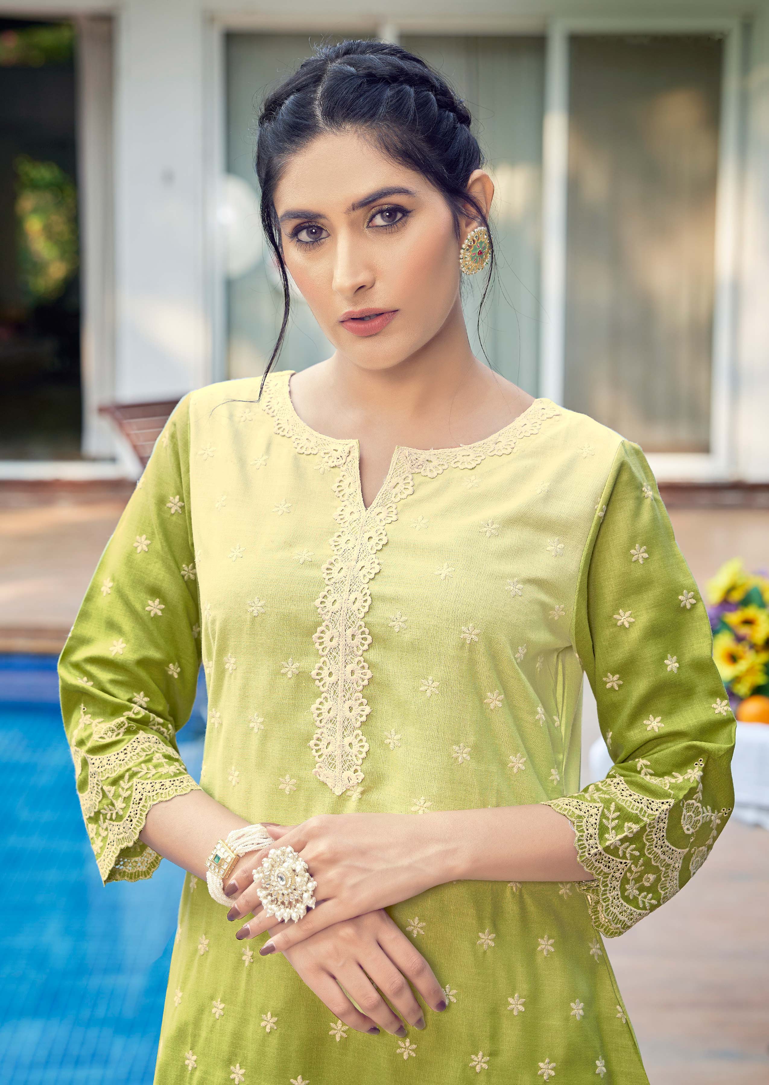 The kurti is adorned with intricate Schiffli embroidery all over, adding a delicate texture and timeless appeal. It features a stylish split crew neckline highlighted with fine lace detailing, enhancing its feminine charm. The hemline is finished with elegant cutwork, bringing a unique and eye-catching detail to the design.