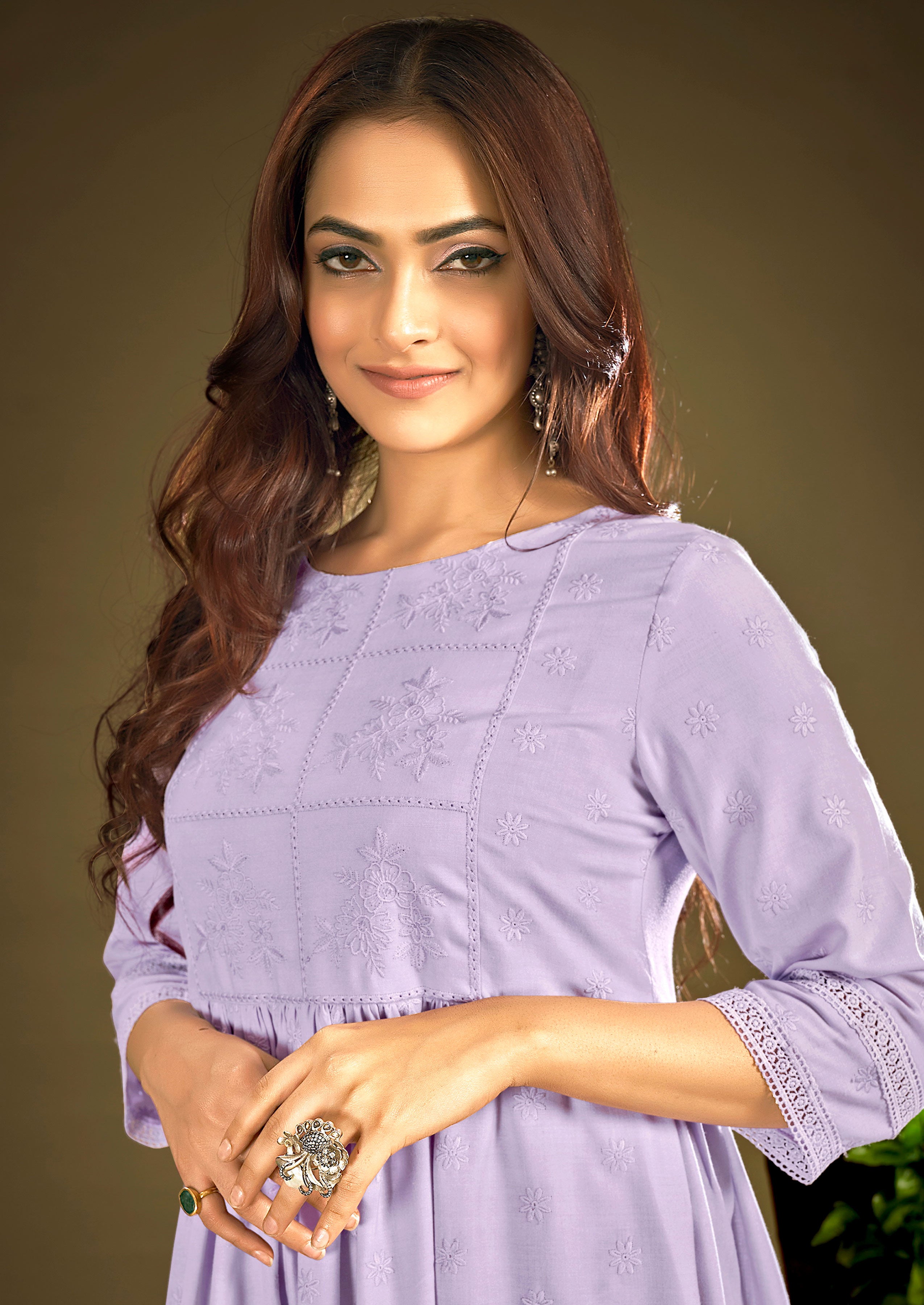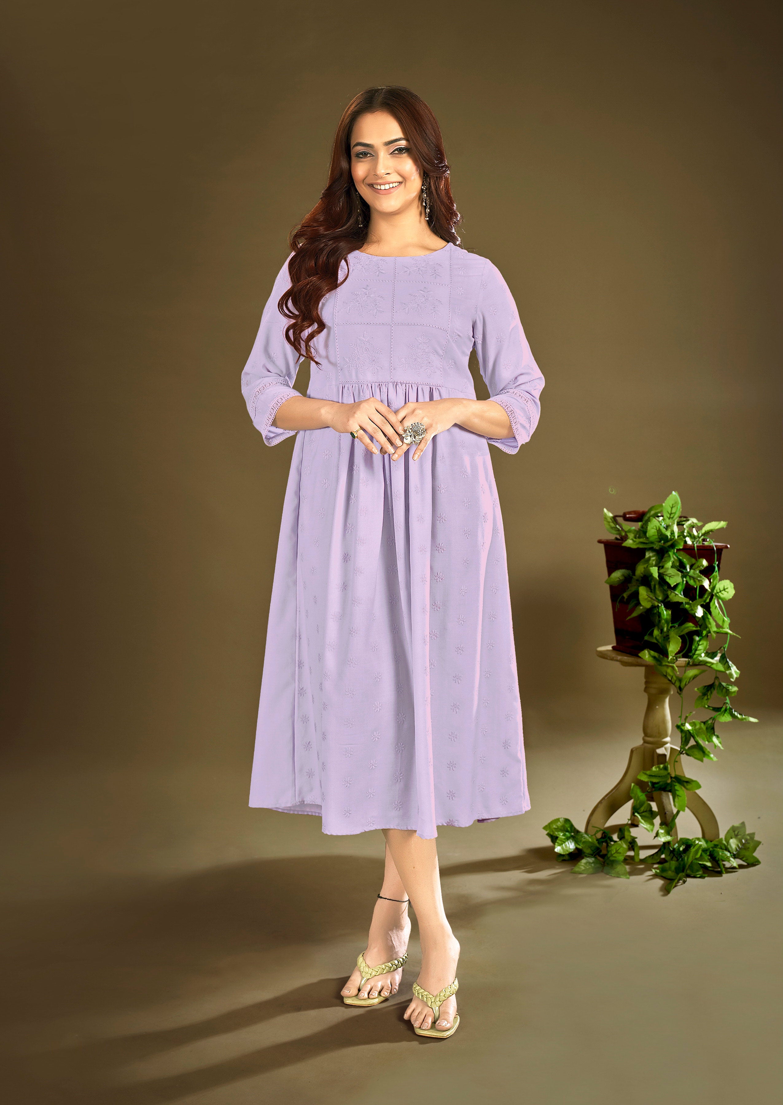 Add a touch of elegance to your wardrobe with this charming lavender frock-style kurti. Crafted from soft and breathable spun cotton, this kurti features delicate Schiffli embroidery work all over, adding a graceful and textured appeal. The frock comes with a gathered waistline that offers a flattering, flowy silhouette, perfect for everyday comfort and style.