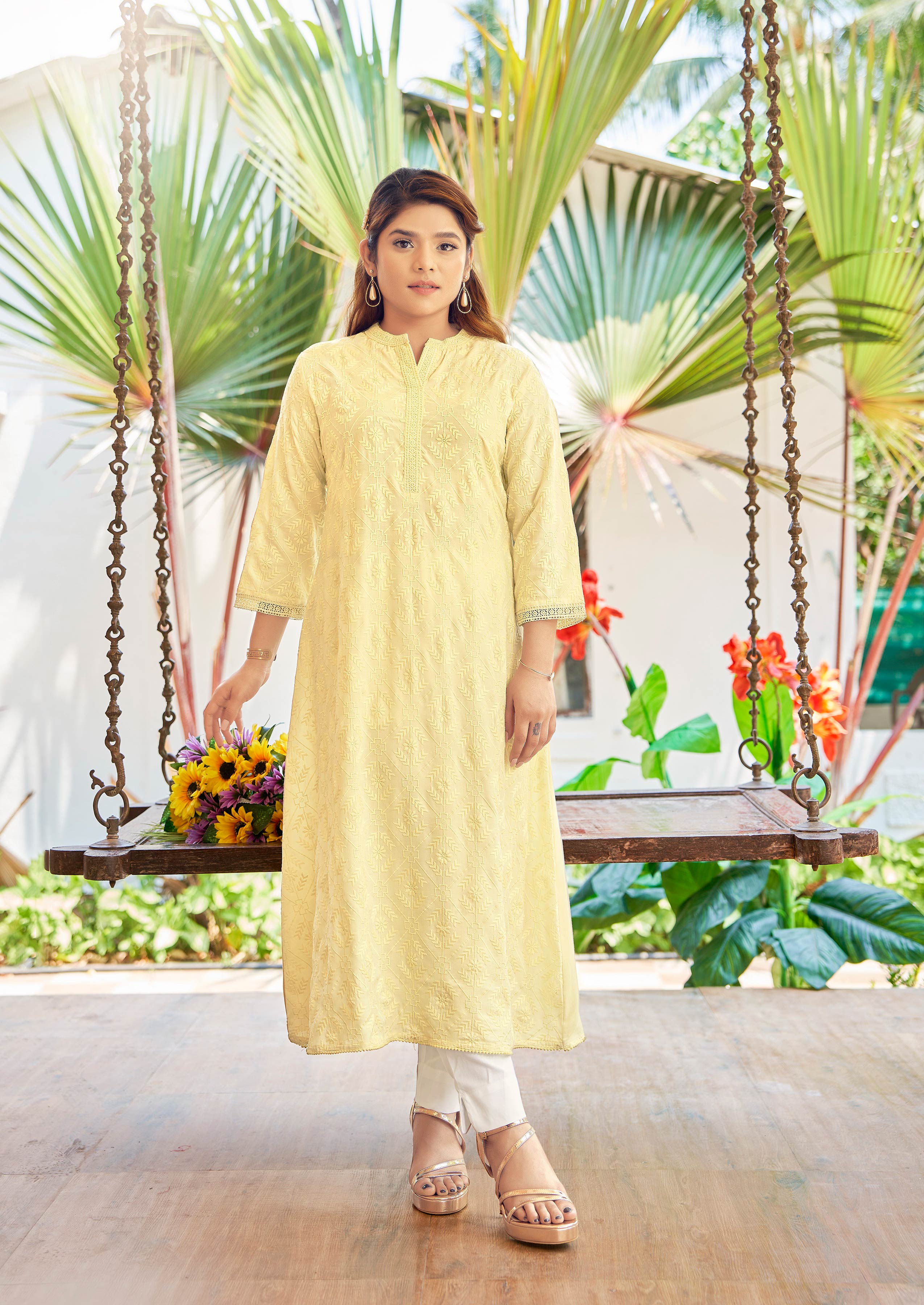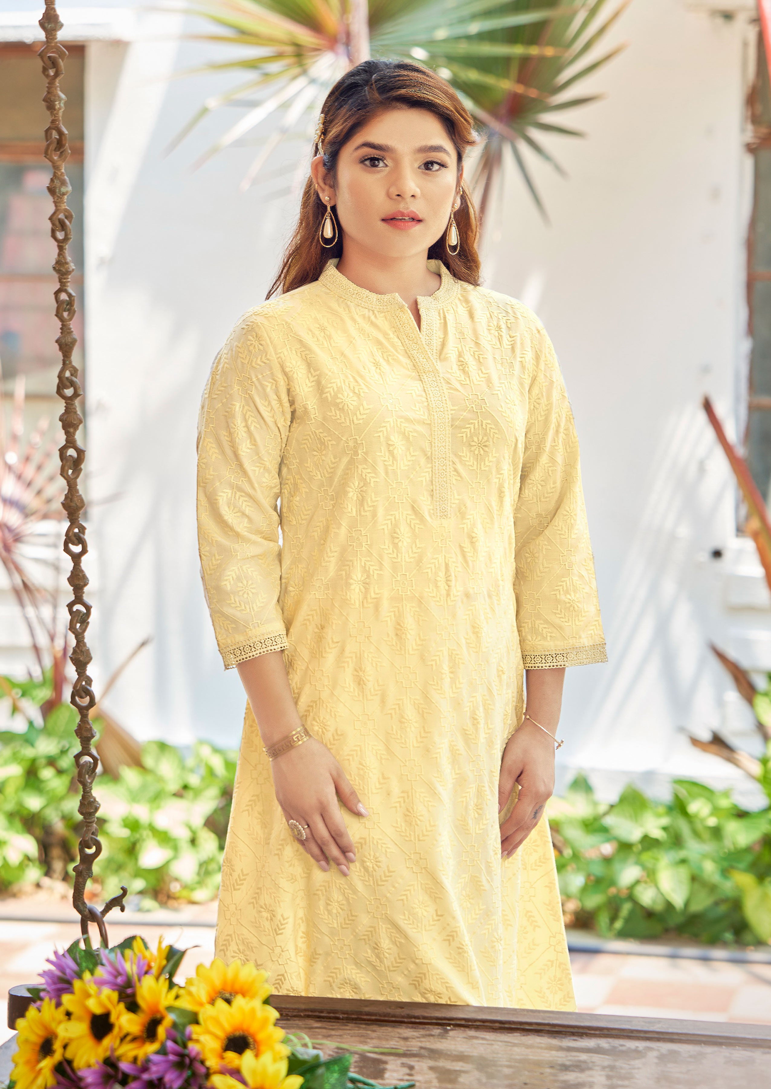 Laxmipati Janki Schiffli Embroidered Spun Cotton Straight Kurti in Butter Yellow Color