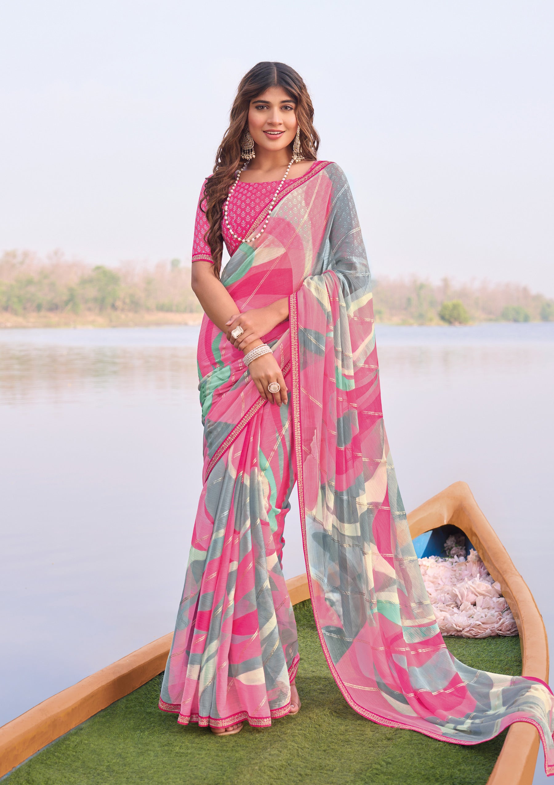 Laxmipati Madhubala Abstract Printed Chiffon Saree in Pink Color with Unstitched Blouse