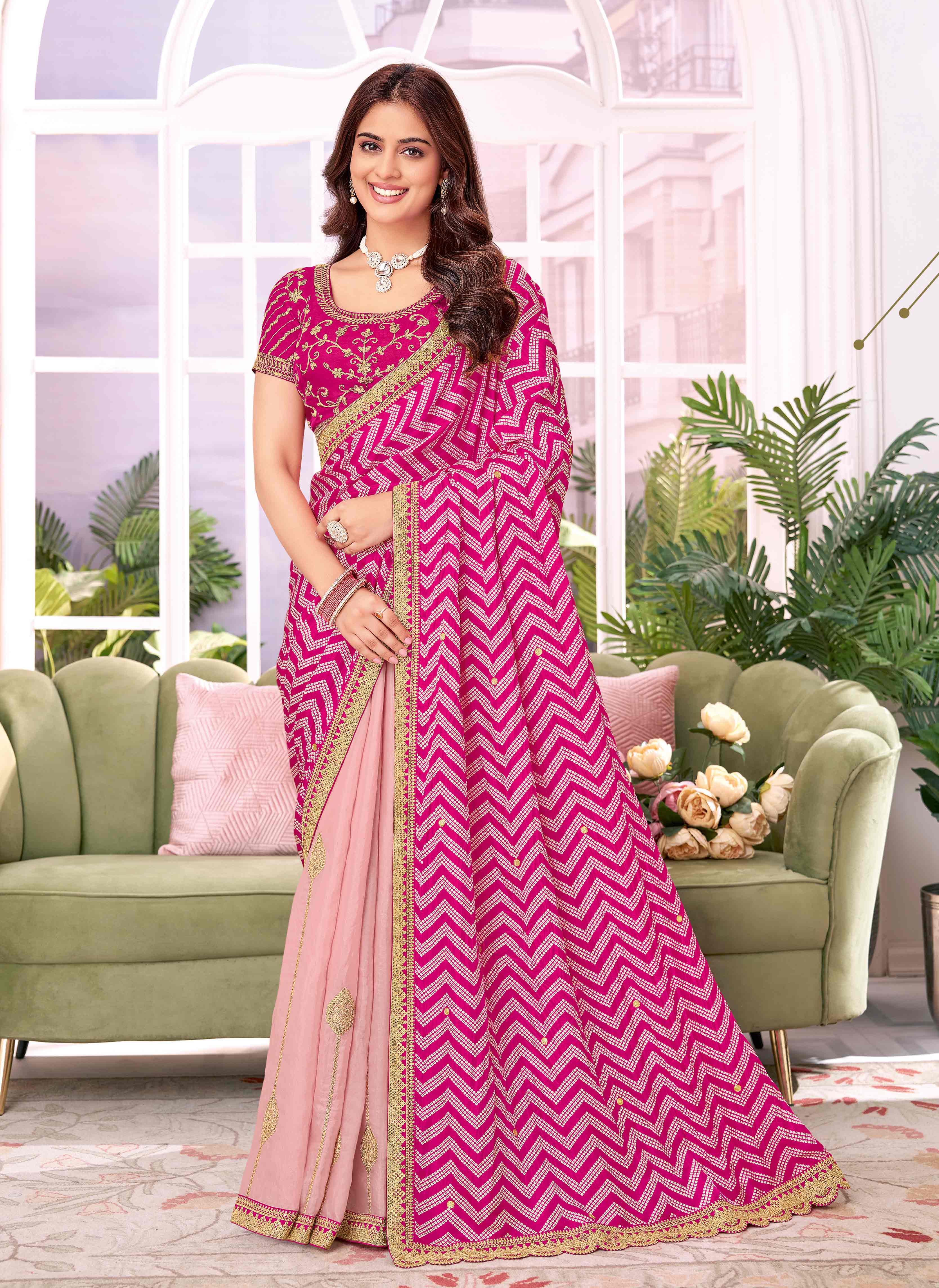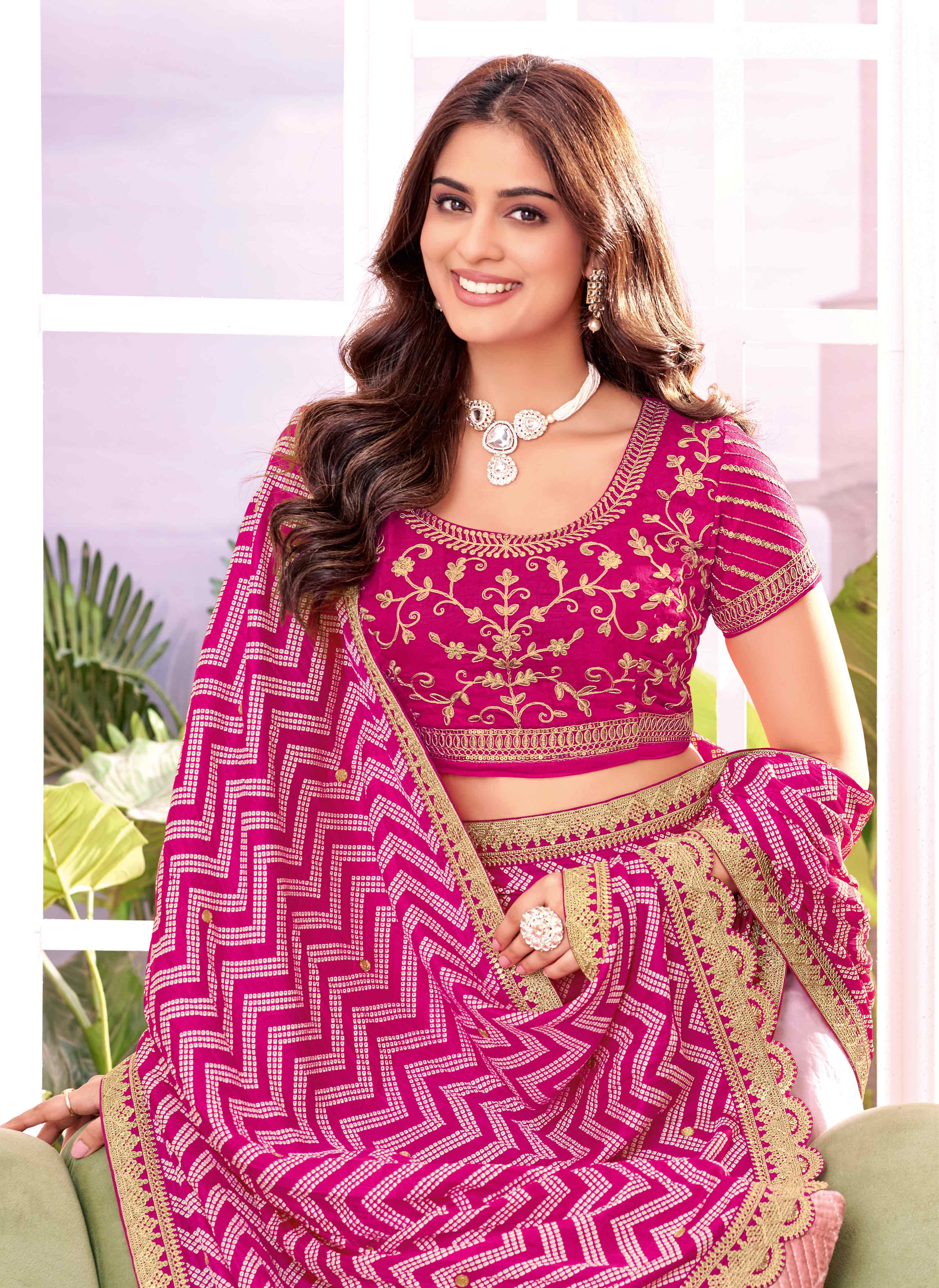 Laxmipati Megha Bandhani Printed Chiffon Saree in Magenta Color with Unstitched Blouse