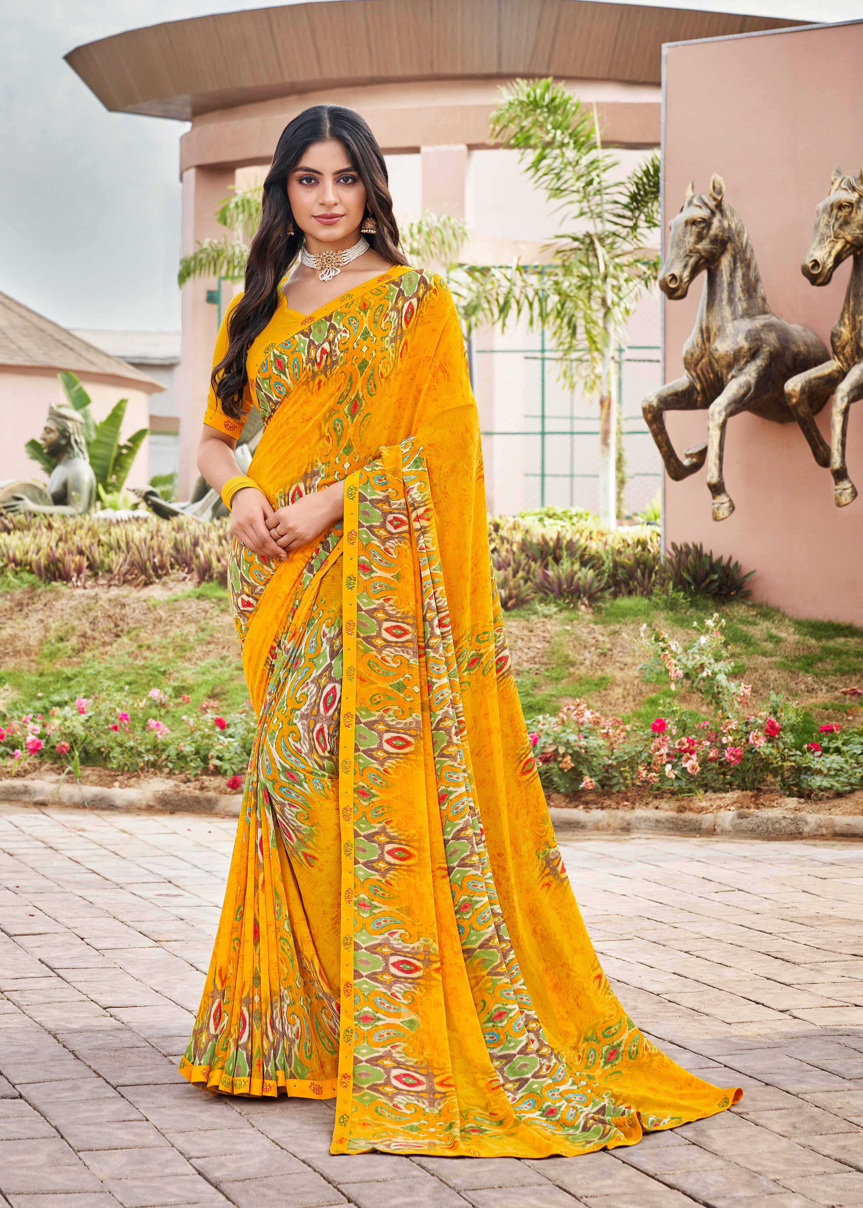 Laxmipati Noori-2 ikkat Printed Georgette Saree in Mustard Color with Unstitched Blouse