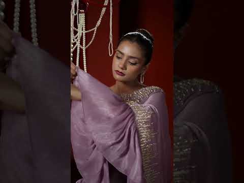 The saree is paired with a matching plum-colored blouse made from tissue organza, adding a delicate contrast in texture while keeping the color story seamless. The modern saree blouse is mostly plain, allowing the saree to remain the highlight, but features the same straight-line zari, stone, and sequin embroidery on the neckline. This matching embroidery detail ties the blouse and saree together, creating a coordinated and well-finished appearance. The tissue organza fabric gives the blouse a slightly crisp yet refined feel, complementing the fluid drape of the georgette saree.