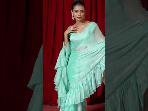 Overall, this sea green party wear saree for women ensemble brings together flowing georgette fabric, layered frill detailing, subtle stone embroidery on the saree, and a finely embroidered tissue organza blouse. The result is a graceful, modern outfit that works beautifully for festive occasions, receptions, and elegant evening wear.