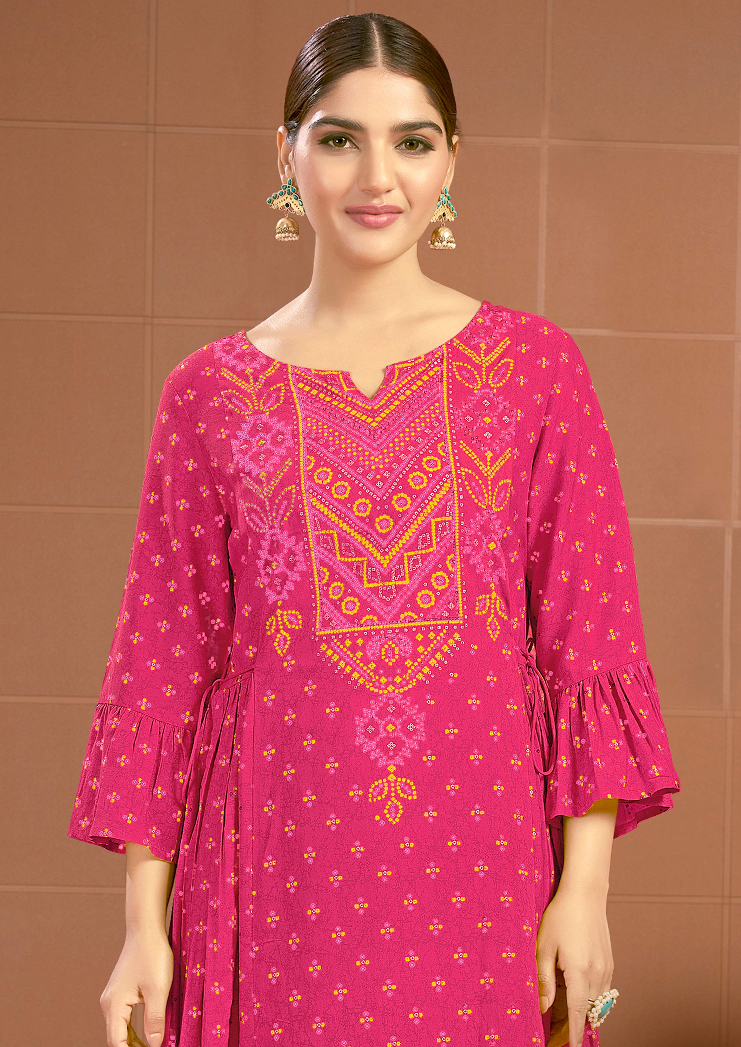Make a vibrant statement with this magenta frock-style kurti featuring an all-over traditional Bandhani print. Crafted from soft and flowy viscose fabric, this kurti offers a perfect blend of ethnic charm and everyday comfort.