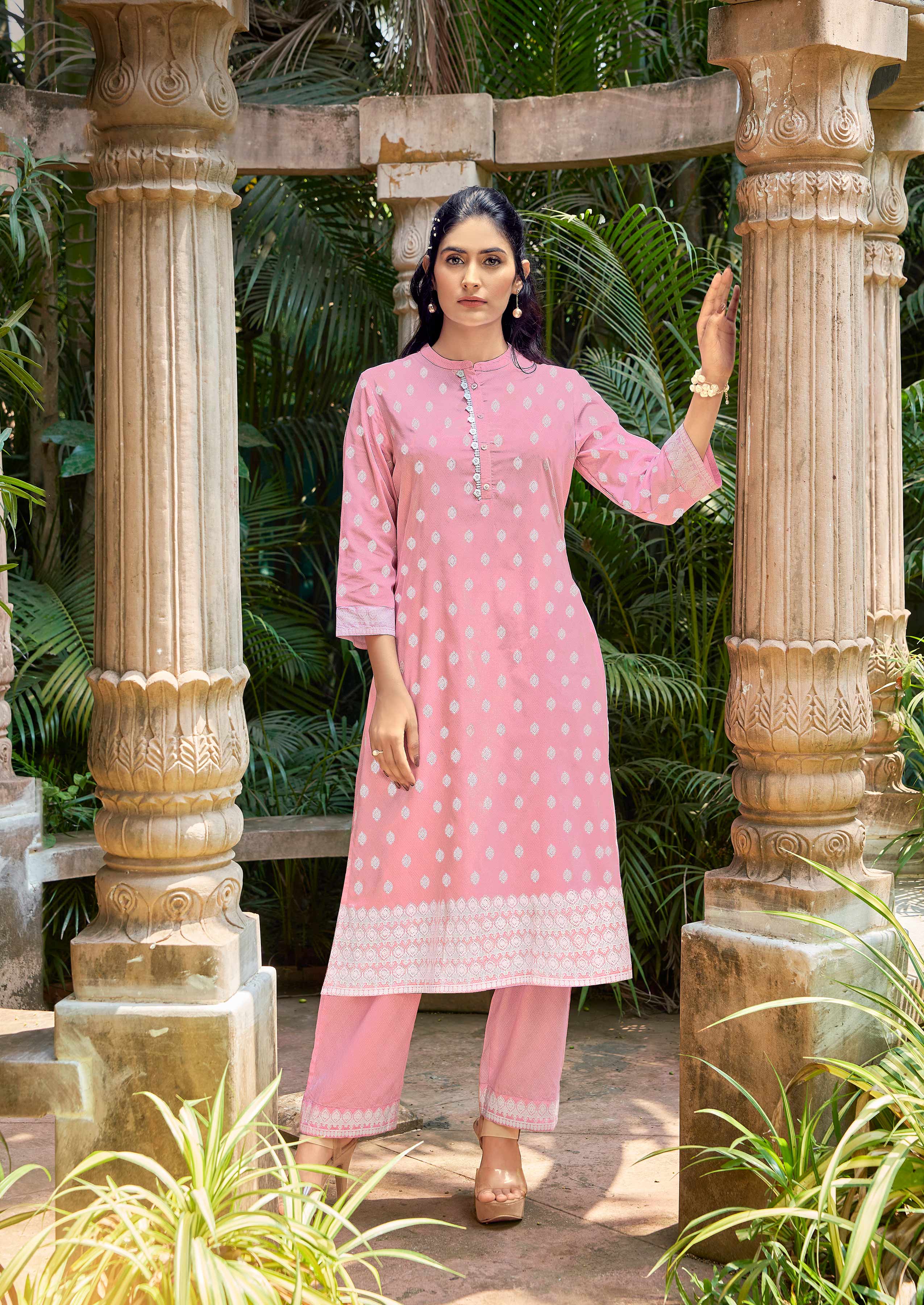 Effortlessly elegant and comfortable, this pastel pink kurti set is perfect for everyday wear with a touch of style. The kurti is crafted from soft viscose fabric and features subtle puff print all over, giving it a graceful and textured appeal. It is designed with a mandarin collar and button detailing on the neckline, adding a refined and contemporary touch.