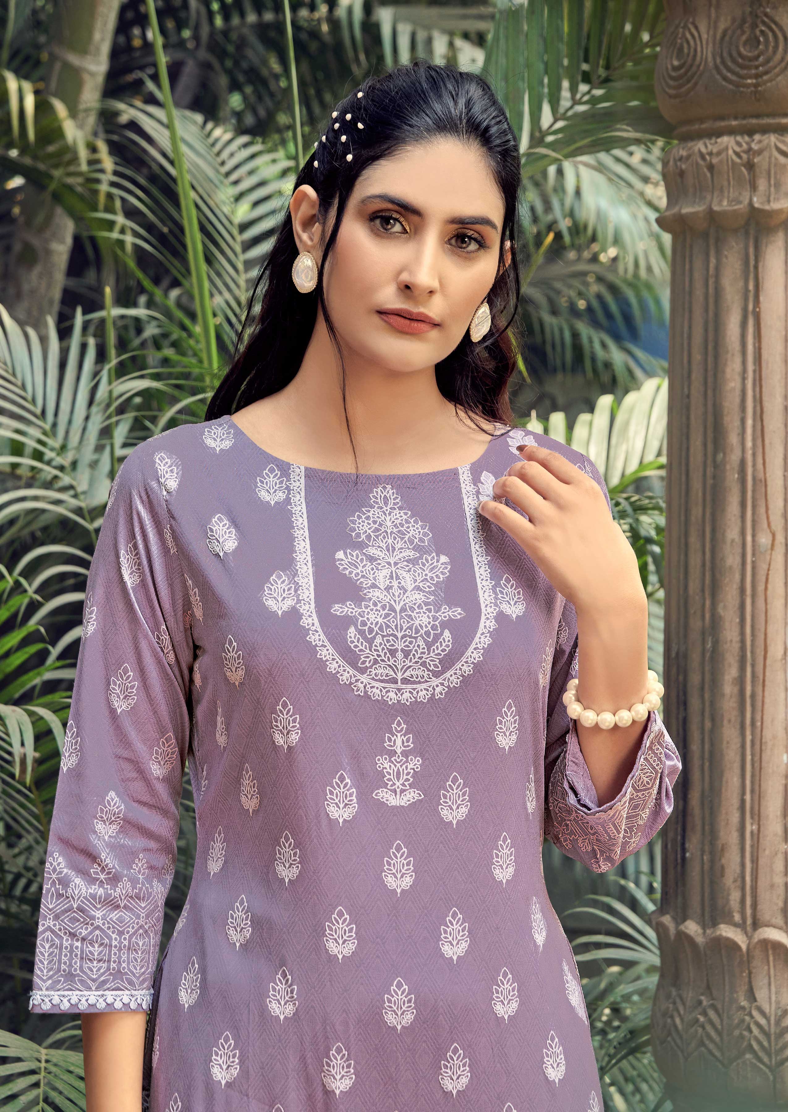 Brighten up your everyday wardrobe with this graceful purple kurti set, designed for effortless comfort and style. The kurti is crafted from soft viscose fabric and features a charming floral puff print all over, adding a delicate and feminine touch to the look.