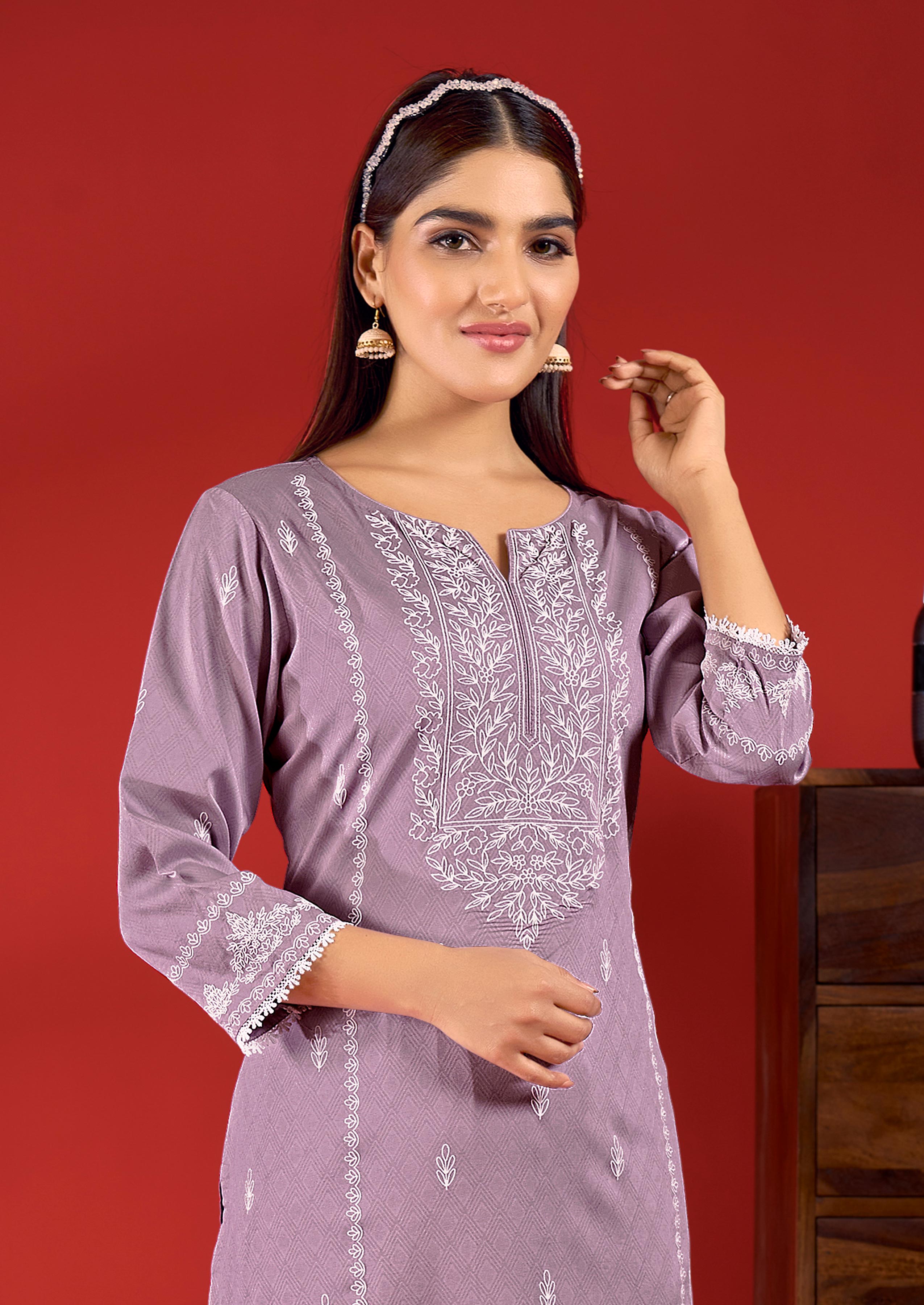 Add a touch of elegance to your everyday wear with this stylish purple kurti set. Made from soft and breathable viscose fabric, the kurti features an all-over puff print that adds subtle texture and charm to the look. The design is enhanced with a smart mandarin neckline, 3/4th sleeves, and functional side slits, offering both comfort and a flattering fit.