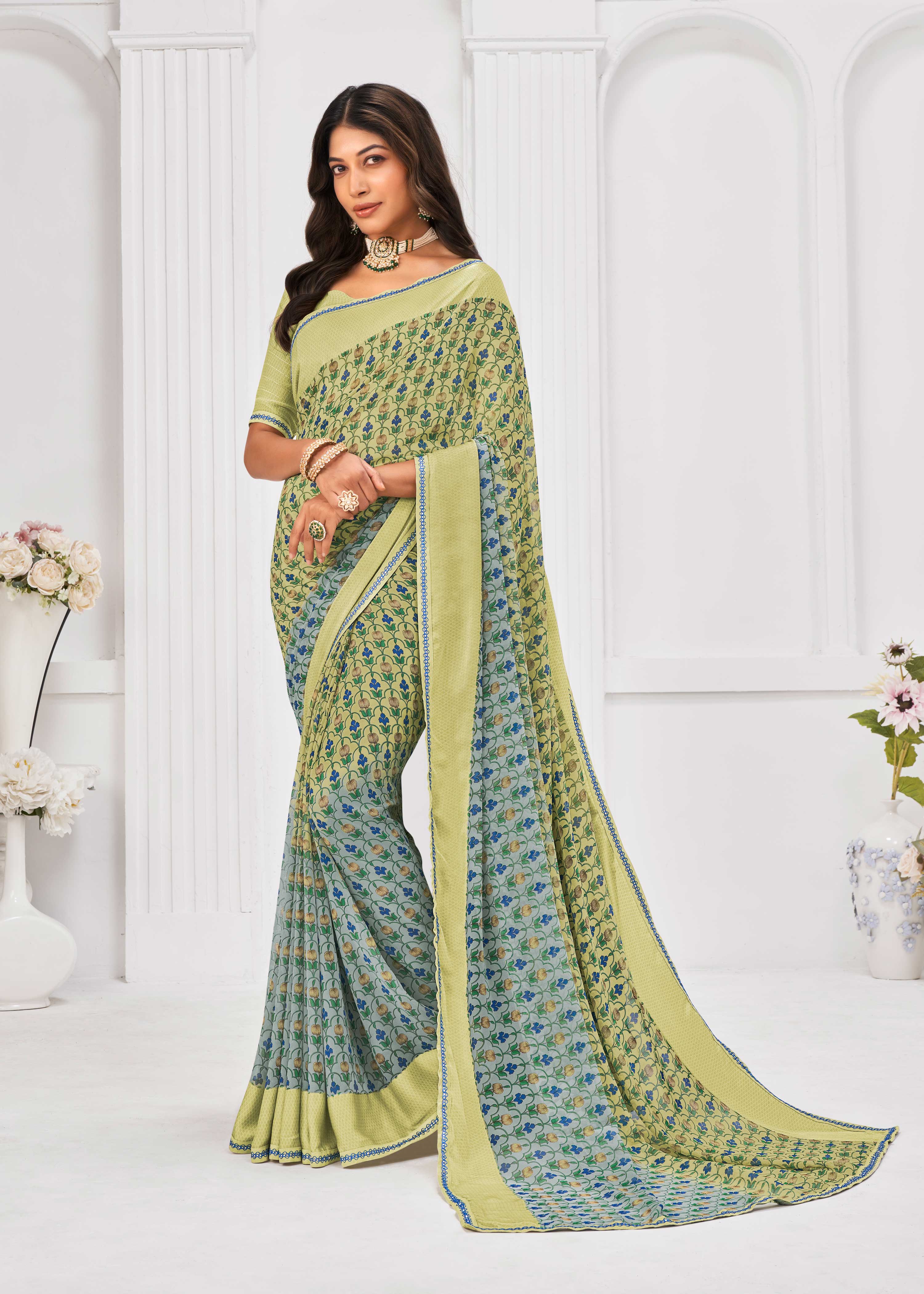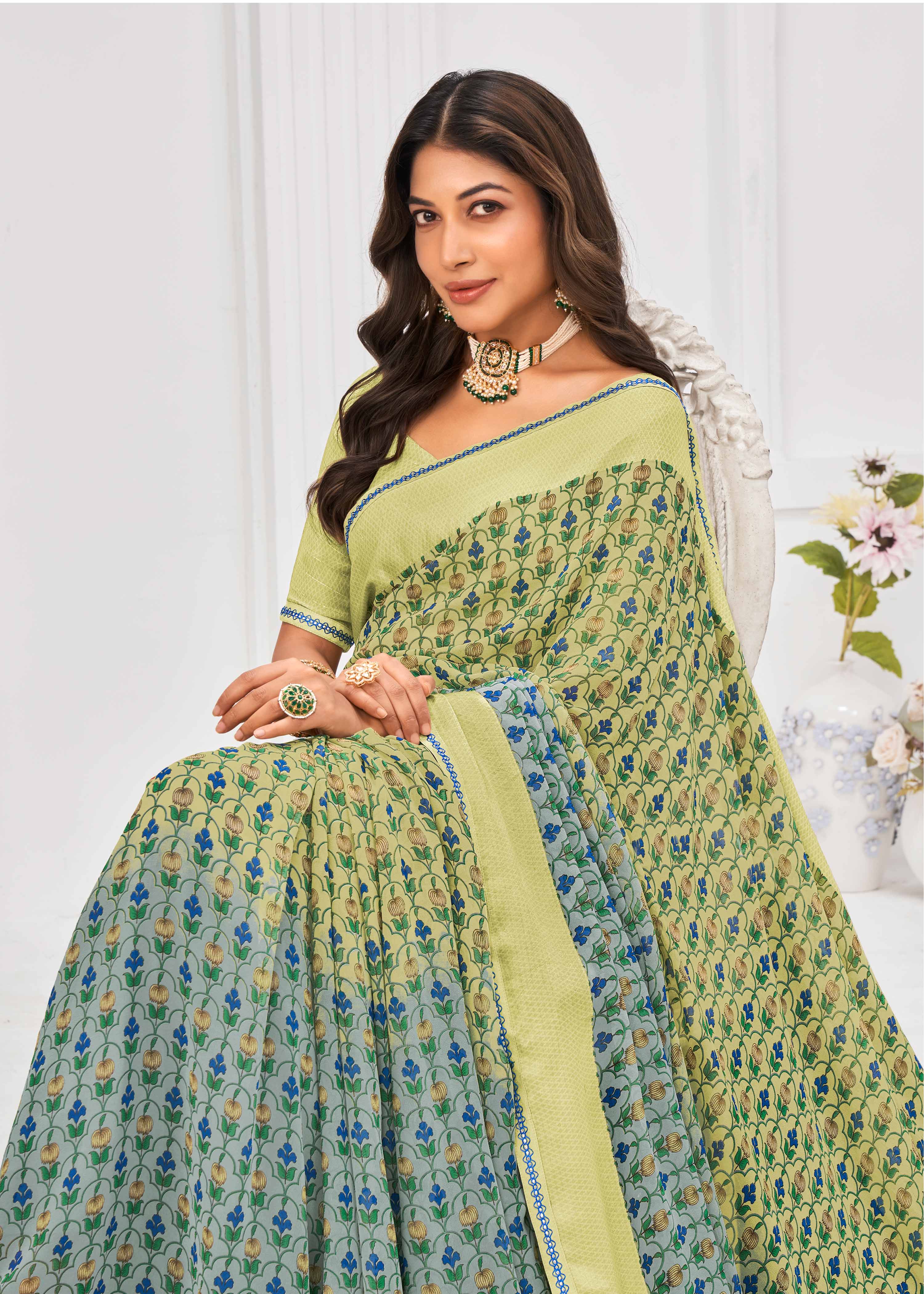 Laxmipati Sitaphal Floral Printed Georgette Saree in Pastel Olive Green Color with Unstitched Blouse