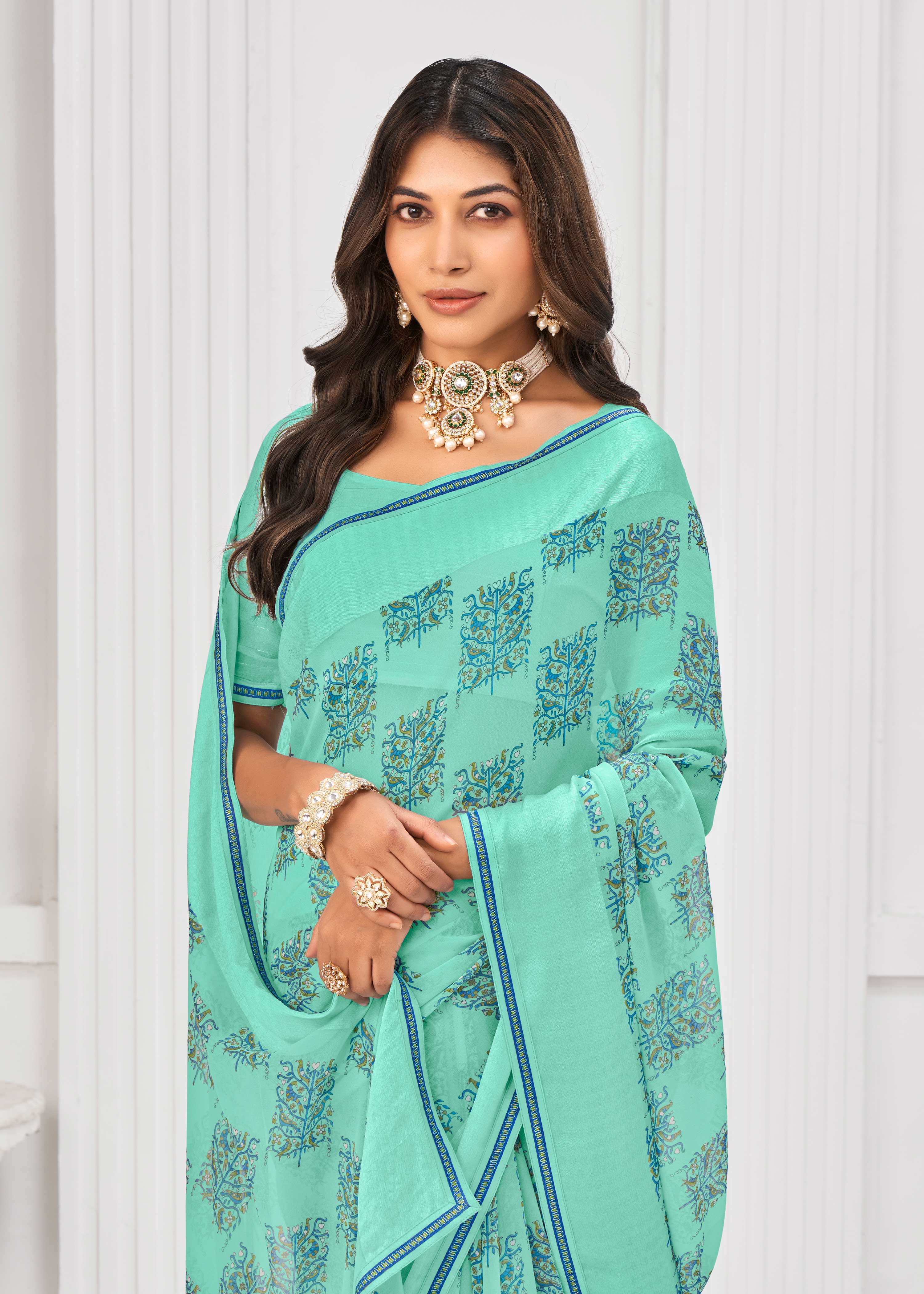 Laxmipati Sitaphal Floral Printed Georgette Saree in Turquoise Blue Color with Unstitched Blouse