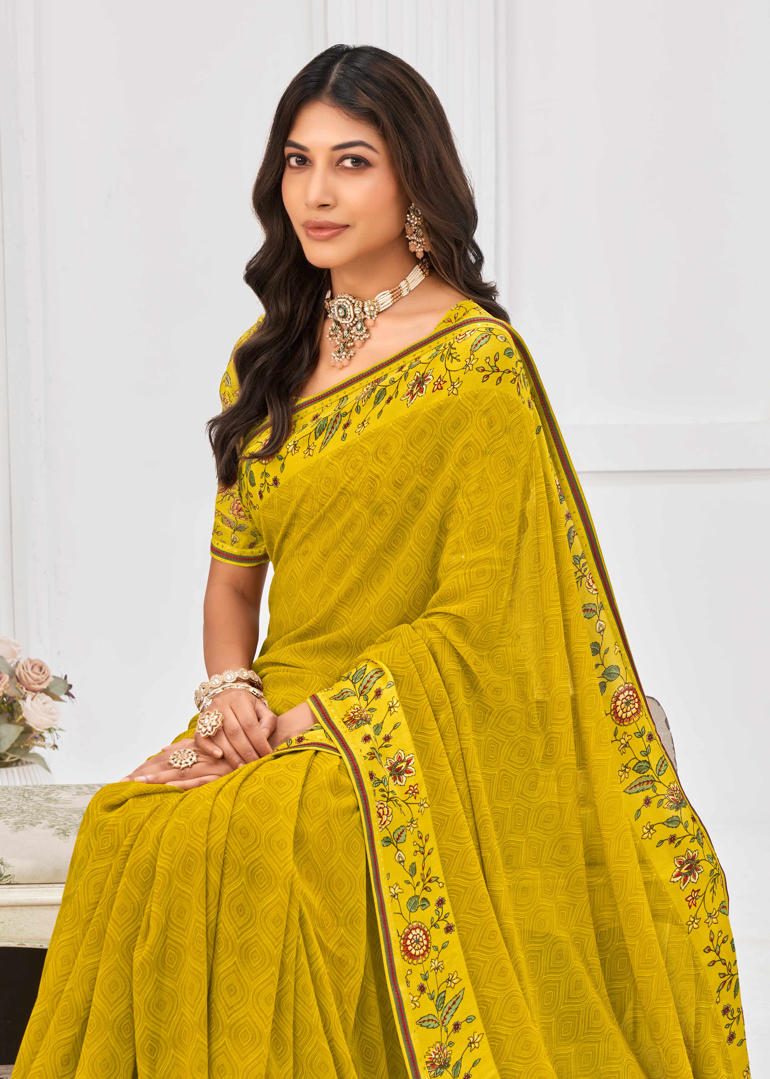 Laxmipati Sitaphal Geometric Printed Georgette Saree in Mustard Color with Unstitched Blouse