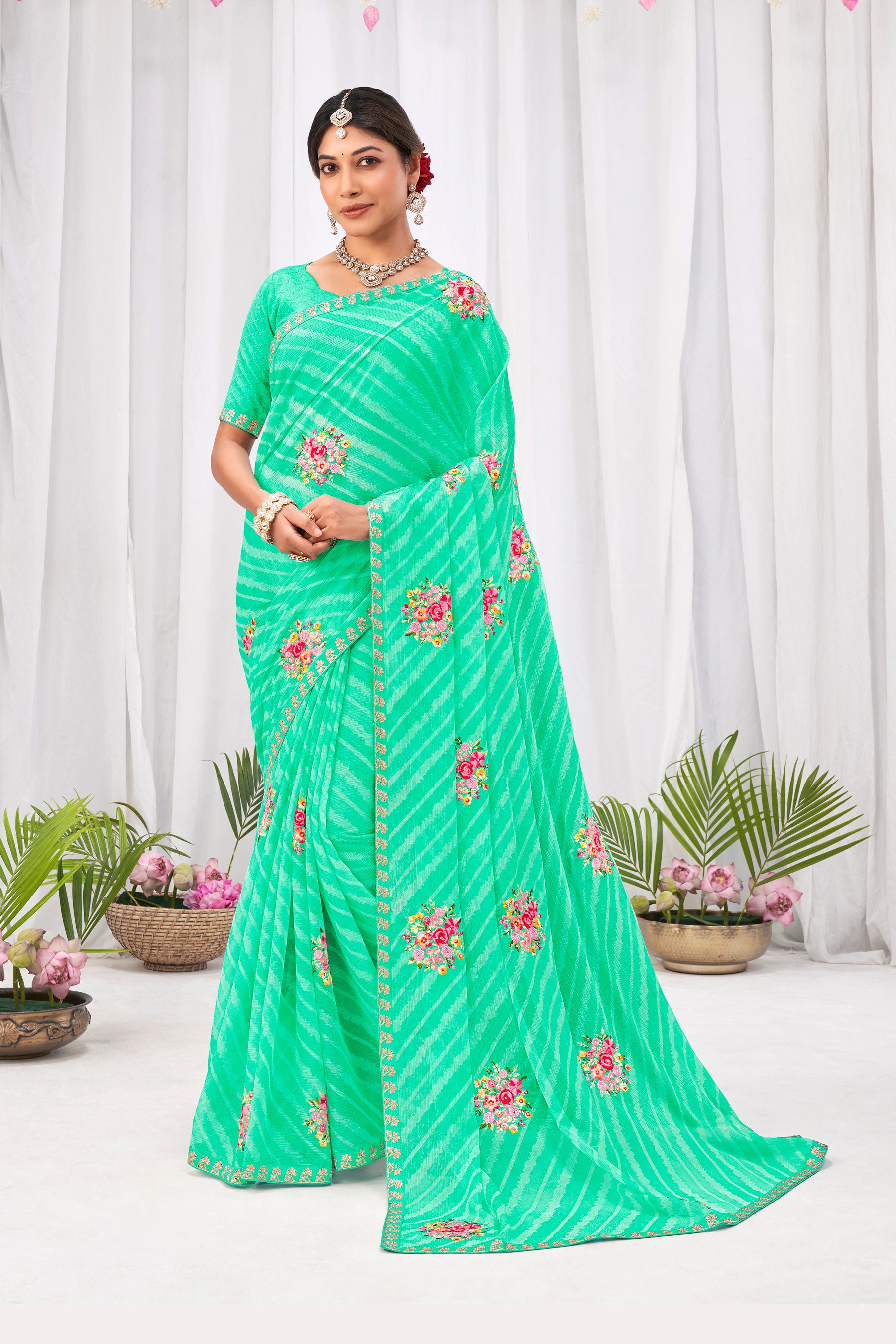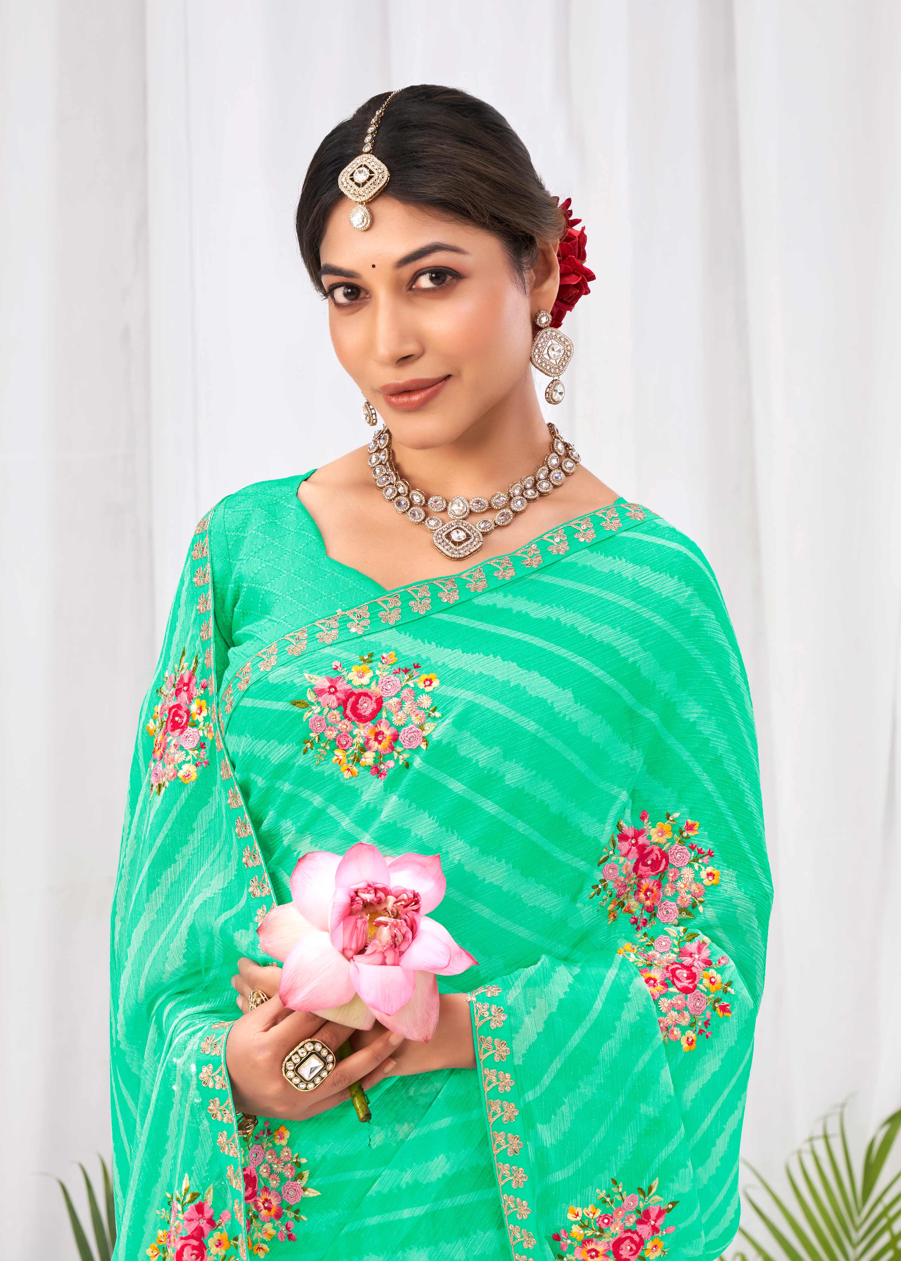 Laxmipati Sushma Floral Embroidered Chiffon Saree in Teal Green Color with Unstitched Blouse
