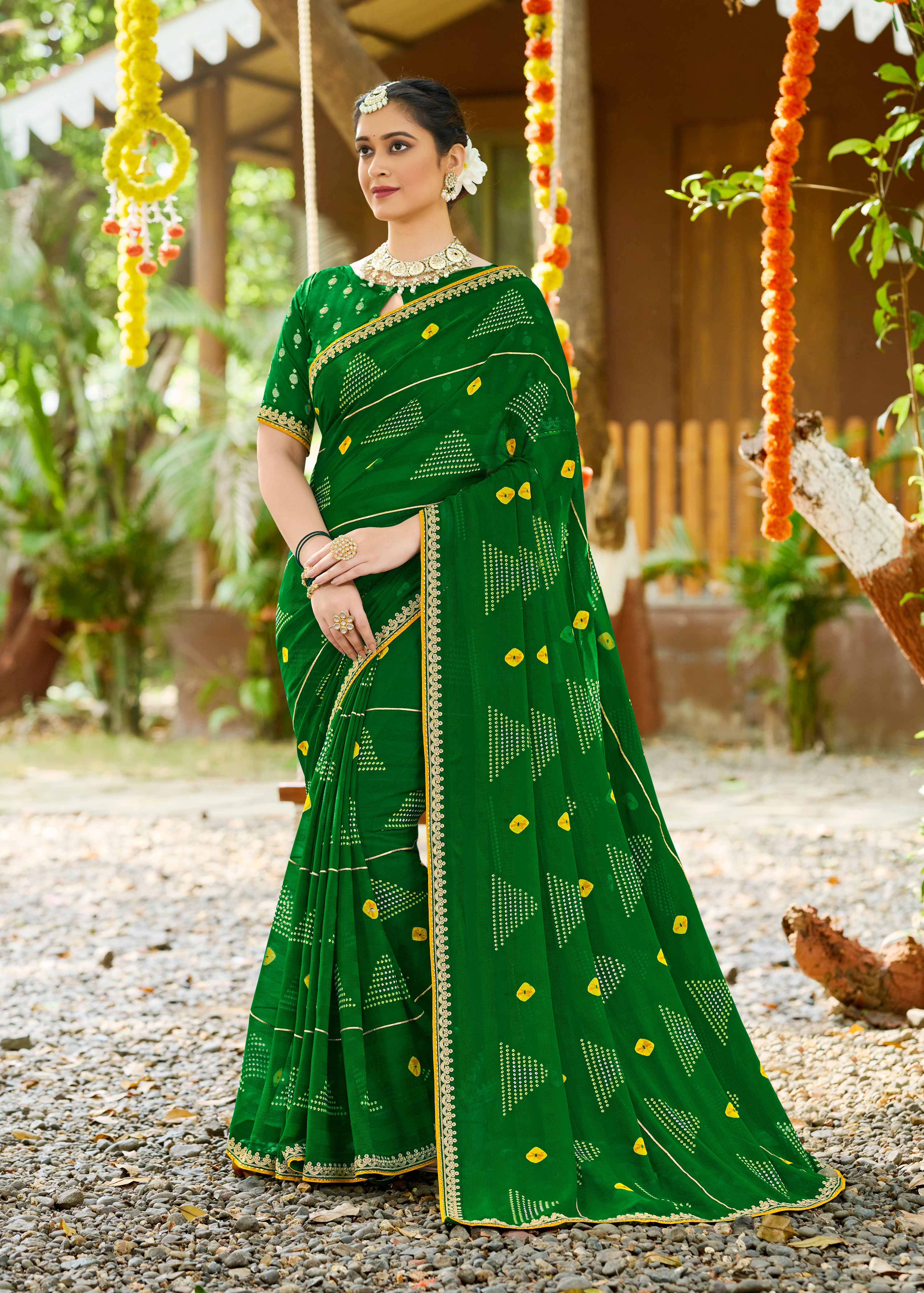 Laxmipati Upavan Bandhani Printed along with Gota Patti Georgette Saree in Green Color with Unstitched Blouse