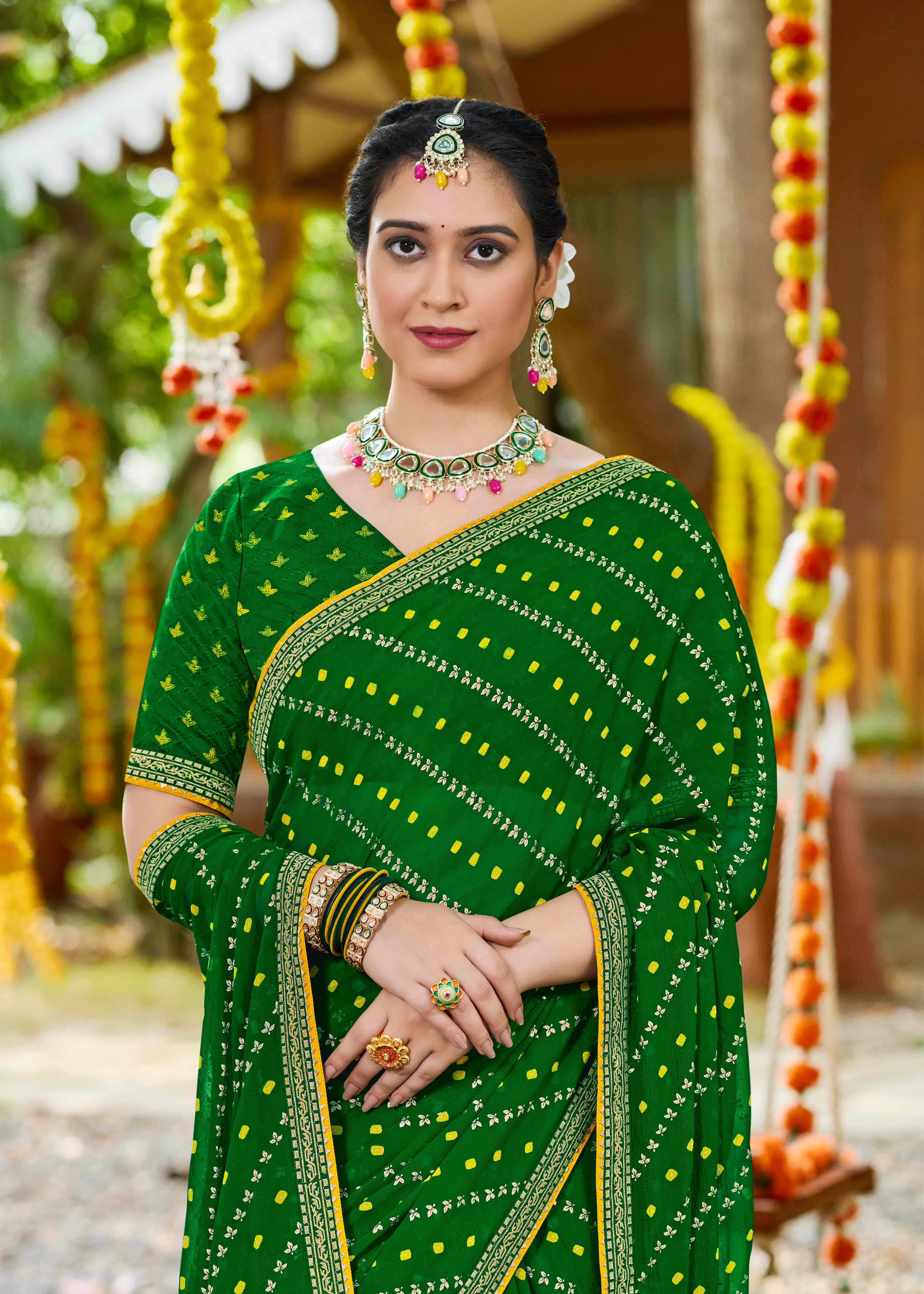 Lightweight and effortlessly elegant, your chiffon saree transitions seamlessly from casual brunches to work meetings and daytime celebrations. For an easygoing daytime vibe, team it with a printed blouse and fun accessories. At the office, opt for a solid-toned blouse and minimal jewellery to keep things polished yet refined. To dress it up for events, just add statement earrings and experiment with a chic drape — because real style lies in how you make it your own.